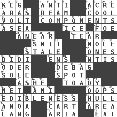ACROSS 1. Cask 4. Against 8. 43,560 square feet 12. Caspian sea tributary 14. 480, 500 or 516 sheets of paper 15. Calm and collected 16. Electrical Unit 17. Pieces 20. Toward the sea 21. Frozen water 22. Enemy 23. Approach 27. Rend 29. Stricken, poetically 31. Undercover agent 34. Lacking originality or spontaneity 35. Singles 36. "You Light Up My Life" star Conn 39. Followers of ems 41. Nuclear Threat Initiatives 42. River in Europe 43. Debunk (Brit. slang) 46. Not divided or shared with others 47. Blemish 48. American tennis player Robert 51. Sycophant 54. Fish or hair follower 56. Black tropical American cuckoo 58. I made a mistake 61. The property of being fit to eat 66. Frame or body of a ship 67. Small Philippine buffalo 68. Draw slowly or heavily 69. Type of rug 70. Long (Scottish) 71. Roberta Peters solo 72. Erode DOWN 1. Polynesian shrub of the pepper family 2. Greek god of love 3. An organ shaped like a helmet 4. Curve 5. Modern: prefix 6. Scottish cap 7. Body of Kaffir warriors 8. Adept person 9. Meet 10. Printing process, for short 11. Otherwise 13. Comedian Laurel of Laurel & Hardy 18. Sep. follower 19. Born 24. Eastern Standard Time (abbr.) 25. Nanny (var.) 26. Cause heat under the collar 28. Amid 30. Is inclined (to) 32. Flowery wreath 33. Double-curved letter 34. Fathers 36. Two (Sp.) 37. Wedding promise 38. Accusation by an informer 40. Back-to-school mo. 44. Surprise greeting 45. _ moment's notice (2 wds.) 49. Actor Linden 50. Compass dir. 52. Capital of the state of Qatar 53. You are 54. Be tempered by heat 55. Pulitzer Prize-winning author Ferber 57. South American Indian 59. Entreaty 60. Narrow board 62. Container for groceries 63. Hearing organ 64. Indian title of respect (Mr.) 65. R.R. building