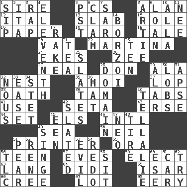 ACROSS 1. Male parent of an animal 5. Personal Computers (abbr.) 8. Actor Alda or Thicke 12. Slanted text style (abbr.) 13. Broad, flat, thick piece 15. Hero or heavy, e.g. 16. Some stationery 18. Pacific island yam 19. Lie 20. Large container 22. Chrissie's court nemesis 24. Makes supply last 26. Last letter of the English alphabet 27. Actress Patricia 28. Spanish title 29. Chicken ___ king 32. Egg locale 35. Mine, in Marseilles 37. Chop off 38. Pledge 39. Scottish cap 40. Bar bills 41. Purpose 42. Bristle 43. Celtic language 44. Put into a specified state 45. Raised railways 46. International (abbr.) 49. Ocean 50. Famous astronaut Armstrong 51. Hard copy producer 55. Mouth or opening 56. Adolescent 57. Nights before holidays 59. Opt 63. Long (Scottish) 64. "You Light Up My Life" star Conn 65. Austrian river, tributary to the Danube 66. Algonquian 67. Car dealer's back yard 68. Suggestive of the supernatural DOWN 1. Small drink 2. Call ___ day 3. Reproach for some lapse or misdeed 4. Veterans Day date 5. Pacific Standard Time (abbr.) 6. Dollar (slang) 7. "Two Mules for Sister ____" 8. Nick name for Arthur 9. Grant temporary use of 10. Silent film actress Nazimova 11. Born 14. Russian wolfhound 17. Immoral or dissolute person 21. Beverage made from leaves 23. "___ Little Indians" 25. Chalkboards 28. Kingdom 29. Having or resembling wings 30. Tennis shots 31. Domed church section 32. Good sense 33. Comfort 34. Proofreading order 36. Floor covering 40. Copy Pinocchio 42. Scheduled 45. Car or cant ending 47. Modern: prefix 48. Hoop that covers a wheel 49. Burn superficially 51. Lightbulb-shaped fruit 52. French philosopher Descartes 53. Morally bad or wrong 54. Make new 56. Affectionate concern, for short 58. Be seated 60. Compass dir. 61. Auto 62. Attempt