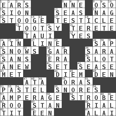 ACROSS 1. Hearing organs 5. Compass dir. 8. Bear (Spanish) 11. The Jewish people; Israel 12. Oceans 13. Tired old horse 14. Moe Howard, for one 17. A testis 19. A girl or young woman (variant) 21. Cigar-shaped 22. "Change" in Tahitian 23. Consenting reply 24. The 18th letter of the Arabic alphabet 27. Actor's bit 29. Plant excrement 32. Overwhelms 34. Slender fish 36. "Two Mules for Sister ____" 37. Without 38. Period 39. Groove 40. Afresh 41. Put into a specified state 42. Gospel singer Marvin 43. Was introduced to 44. South Vietnam president (1954) 46. Lair 47. "One Day ___ Time" 50. Mouths or openings 52. Soft color 55. Sounds asleep 57. Electrical Measurement 59. Disco prop 62. Friend of Pooh 63. Comedian Laurel of Laurel & Hardy 64. Monetary unit of Yemen 65. Teat (slang) 66. Car or cant ending 67. Mountain range southwest of Kyrgyzstan DOWN 1. Double-curved letter 2. Small island 3. Carrot, for example 4. Snout, nose 5. Born 6. Thoroughly unpleasant 7. First name in cosmetics 8. Single time 9. Table seasoning 10. Double curve, resembling the letter S 12. Filthy place 15. Finish lines 16. Needle holder 18. Big collection agency 20. Burns superficially 24. Indian state 25. Empty; void 26. Music written for nine 28. Having ears or earlike features 29. Vegetable dish 30. Came up 31. Eucharist need 33. Compass dir. 35. Food allowance for one day 36. Compass dir. 42. Don Adams' spy role 45. Greek god of love 47. Had dinner 48. Laconic 49. Having winglike extensions 51. Father Junipero _ 52. Piece 53. Mine, in Marseilles 54. Specific locale 55. Elected rep. 56. Land 58. Separate the seeds from cotton 60. Sound made by sheep 61. Biblical high priest
