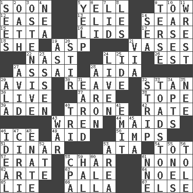 ACROSS 1. Within a short period 5. Shout 9. Pull behind 12. Comfort 13. Writer Wiesel 14. Dry up 15. Singer James 16. Flaplike coverings 17. Celtic language 18. A female animal or person 19. Cleo's killer 21. Flower holders 22. Political cartoonist Thomas 24. Cards in a Roman deck? 26. Eastern Standard Time (abbr.) 27. Slender Brazilian palm 28. Opera by Verdi 29. Deliberation 30. Break or tear apart 32. Comedian Laurel of Laurel & Hardy 36. Moving, as bait 37. "We ___ not amused" (Victoria) 38. Drink excessively 39. An important port of Yemen 40. Marketplace scale 42. Pace 43. Songbird 44. Women servants 46. Frozen water 49. Assist 50. Naughty children 51. Middle Eastern gold or silver currency 53. "One Day ___ Time" 54. Small child 57. Part of Q.E.F. 58. Burn to charcoal 61. Words to Nanette 62. Johnson of "Laugh-In" 63. Diluted with white 64. Christmas carol 65. Falsehood 66. Silent film actress Nazimova 67. Otherwise DOWN 1. Perceives with the eye 2. Pledge 3. Clearly or manifestly demonstrative 4. Teachers' org. 5. Sharp bark 6. Biblical high priest 7. Hat (slang) 8. French article 9. Laconic 10. Fertile tracts in a desert 11. Take or capture by force 14. Ocean 19. White ___ sheet 20. Agitate 21. By way of 23. NE Netherlands city 24. Make or become more lively 25. Binary compound 27. Enthusiastic 28. Composer Copland 29. According to 31. Having ears or earlike features 32. Remove all contents or possession from 33. Inedible or poisonous agaric 34. Tenement units (abbr.) 35. Born 40. Three (prefix) 41. Send forth 43. Armed conflict 45. Housemaid (var.) 46. Standard of perfection 47. High-altitude cloud 48. Maternal 52. Had dinner 53. Type of rug 55. Singles 56. Lacquered or enameled metalware 58. Accounting whiz (abbr.) 59. Actor Linden 60. 100% 61. Compass dir.