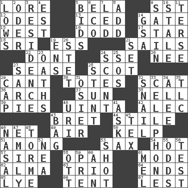 ACROSS 1. Old wives' tales, e.g. 5. Actor Lugosi 9. Fast jet (abbr.) 12. Lyric poems 13. On the rocks 14. Yard entry 15. Compass direction 16. Texas town _ City 17. Play the lead 18. Indian title of respect (Mr.) 19. Double-curved letter 21. Travel by water 22. Do not 24. Compass dir. 26. Born 27. Gospel singer Marvin 28. Native of Scotland 29. Patter 30. Lugs 32. Get outta here! 36. Bowlike part 37. Player for Phoenix 38. 1994 drama film starring Jodie Foster 39. Sliced desserts 40. National forest in Provo, Utah 42. Actor Baldwin 43. Cy Young winner Saberhagen 44. Vertical member of a panel or frame 46. Fish or hair follower 49. Wind 50. Seaweed 51. Amid 53. Saxophone 54. Being at a high temperature 57. Father 58. Brightly colored fish 61. Method 62. _ mater 63. Musical group of three 64. Extremities 65. Potassium hydroxide 66. Portable shelter 67. For fear that DOWN 1. Moos 2. River in Europe 3. Dwelling 4. Eastern Standard Time (abbr.) 5. Auction offers 6. Environmental prefix 7. Directed 8. Increase 9. Smooth fabric 10. Having lost freshness 11. Laconic 14. Girls' org. (abbr.) 19. Followers of ems 20. Proofreading order 21. Arrange properly for use 23. Expletives 24. Odor 25. Mayday 27. Indian skirt 28. Check the growth or development of 29. Head covering 31. Flexible twig of a willow tree 32. Slow-paced one 33. Portable communications device 34. Toward shelter 35. Affectionate concern, for short 40. RI univ. 41. "____ silly question..." 43. Container for groceries 45. John Ritter's dad 46. Relating to the nose 47. Poet Dickinson 48. Singer Mel 52. Teachers' org. 53. Guess 55. Probability 56. Trial 58. Baseball player Mel 59. Before (prefix) 60. The 18th letter of the Arabic alphabet 61. Cartoonist voice _ Blanc