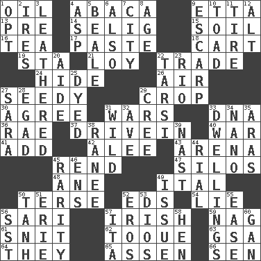 ACROSS 1. Petroleum 4. Phillipine bananalike plant 9. Singer James 13. Before (prefix) 14. Former Milwaukee Brewers owner Bud 15. Earth 16. Afternoon social gathering 17. Thick mixture 18. Draw slowly or heavily 19. R.R. building 21. Myrna of the movies 22. Buy and sell 24. Flintstone garb 26. Atmosphere 27. Full of seeds 29. Riding implement 30. Match 31. Armed conflicts 33. Heredity factor (abbr.) 36. Actress Charlotte 37. Popular '50s hangout 40. Armed conflict 41. Increase 42. Toward shelter 43. Sports stadium 45. Tear apart 47. Grain storage towers 48. A saturated hydrocarbon 49. Slanted text style (abbr.) 50. Laconic 52. Begley and Asner 54. Falsehood 56. Indian skirt 57. From or relating to Ireland 59. Tired old horse 61. In a ____ (agitated or irritated) 62. Woman's close-fitting hat 63. Girls' org. (abbr.) 64. Those people 65. NE Netherlands city 66. Elected rep. DOWN 1. Elect 2. Angers 3. Resembling or made to resemble leather 4. Viper 5. Memphis, Tenn. Street 6. In addition 7. Municipality 8. Mature 9. Fortification 10. Frog relative 11. Hoop that covers a wheel 12. Keyboard modifier key 20. Assistant 22. Tarsus (plural) 23. _ de Janeiro 25. Colored 27. "Two Mules for Sister ____" 28. Mild oath 29. Algonquian 31. Rampant 32. "___ Maria" 33. Homes 34. Billionth: prefix 35. Caspian sea tributary 38. Indian princess (variant) 39. Political cartoonist Thomas 44. Monetary unit of Yemen 45. Noteworthy scarcity 46. Followers of ems 49. Come out of 50. Hyperbolic tangent 51. One of the Great Lakes 52. Greek god of love 53. "Vaya con ____" 55. Comfort 56. Fast jet (abbr.) 57. Call ___ day 58. Layer 60. Separate the seeds from cotton