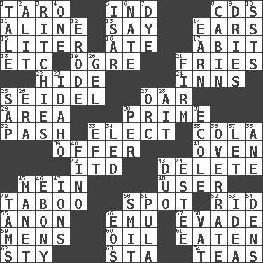 ACROSS 1. Pacific island yam 5. Working for oneself (abbr.) 8. Music discs 11. Place in a line 13. Declare 14. Hearing organs 15. 61 cubic inches 16. Had dinner 17. "This won't hurt ____!" 18. And so on (abbr.) 19. Legendary monster 21. Strips of potato fried in deep fat 22. Flintstone garb 24. Restaurants 25. Beer mug 27. Boat paddle 29. Length times width 30. First class 32. Romantic infatuation 33. Choose 35. Root beer relative 39. Auction bid 41. Baking chamber 42. It would 43. Keyboard key 45. Chow _ 48. One who uses or employs something 49. Off limits 50. Blemish 52. To free from 55. At once, immediately (arch.) 56. Australian flightless bird 57. Elude 59. Not women's 60. Lubricate 61. Eroded 62. Filthy place 63. R.R. building 64. Afternoon social gatherings DOWN 1. Lie 2. Set down 3. Actors Guy, Robert Welles, and Clint 4. Single 5. Austrian river, tributary to the Danube 6. Nathan's nickname 7. Color 8. Small house or cottage 9. Frees from moisture 10. Fast planes 12. Wear away 14. Merit 20. Set 21. Securely fixed in place 23. Potato state 25. Plant excrement 26. Epoch 27. The grampus (Milton) 28. Small island 30. For each 31. Learning spot: Fr. 33. Lizard (obsolete) 34. Directed 36. Make much ado about nothing 37. Allow 38. A saturated hydrocarbon 40. Fine (Spanish) 43. Superhero pair 44. First name in cosmetics 45. French painter Edouard 46. Dark wood 47. Charged particles 49. Scottish caps 50. Stricken, poetically 51. Monetary unit of Botswana 53. It may be bright or harebrained 54. Lairs 56. Greek goddess of the dawn 58. Large container
