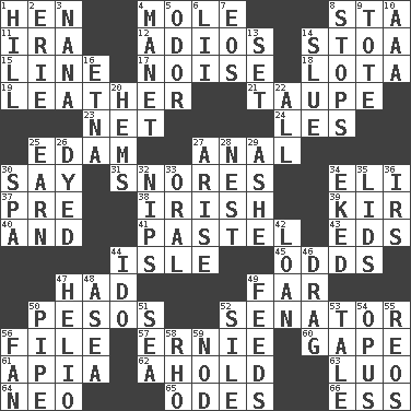 ACROSS 1. Layer 4. Undercover agent 8. R.R. building 11. Retirement account (abbr.) 12. Goodbye (Sp.) 14. Portico 15. Actor's bit 17. Annoying sound 18. Globular water bottle used in Asia 19. Cordwainer's material 21. Grayish beige 23. Fish or hair follower 24. French article 25. Dutch treat 27. Of or related to the anus 30. Declare 31. Sounds asleep 34. Biblical high priest 37. Before (prefix) 38. From or relating to Ireland 39. Apertif with cassis 40. Plus 41. Soft color 43. Begley and Asner 44. Capri or Wright 45. Likelihood 47. Possessed 49. Distant 50. Mexican monetary units 52. Legislator 56. Do some clerical work 57. Bert's buddy 60. Open wide 61. Capital of Western Samoa 62. Hold, grip (Informal) 63. Nilotic language 64. Modern: prefix 65. Lyric poems 66. Double-curved letter DOWN 1. Land elevation 2. One of the Great Lakes 3. Grandmother 4. French painter Edouard 5. Aroma 6. Cards in a Roman deck? 7. Greek goddess of the dawn 8. Constricts 9. Carry 10. American Automobile Association (abbr.) 13. Put into a specified state 14. Change direction abruptly 16. Inactive volcano in Sicily 20. Equivocates 22. Everything 25. Merit 26. Colored 27. Originate 28. Egg locale 29. American tennis player Robert 30. Health resort 32. Cuts off 33. Of the mouth 34. Supplemented with great effort 35. Flaplike coverings 36. Big collection agency 42. Grant temporary use of 44. Wedding promise 46. To be drawn or hauled along 47. Sun: prefix 48. At sea 49. Eats 50. Corncob 51. Ocean 52. Drop; flow; fall 53. Lie 54. Musical composition 55. Vintage cars 56. Avid follower 58. 17th letter of the Greek alphabet 59. Lower and raise head in agreement
