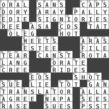ACROSS 1. Of the mouth 5. Without 9. Balmoral and tarboosh 13. Dinghy 14. Like ___ of sunshine 15. Friendly 16. Singer Brickell 17. Seigniories (variant) 19. To riddle 20. White ___ sheet 21. Music discs 22. Make lace 23. Cassini of fashion 25. Being at a high temperature 26. Confronts 30. Caspian sea tributary 34. First name in cosmetics 35. Do some clerical work 36. Lacerate 39. 2nd pers. sing. pres. of can (arch.) 42. Roll call or roster of names 43. Long (Scottish) 44. Declaim 46. Algonquian 47. Amusement-park features 48. Greek goddess of the dawn 51. Went for two points 54. Institute legal proceedings 57. Whopper 58. Small child 60. Separate the seeds from cotton 62. Interpreter 65. Silent film actress Nazimova 66. Match 67. California wine valley 68. Observes 69. Raze (variant) 70. Institutes legal proceedings 71. Inconspicuous attention getter DOWN 1. Baltic tributary 2. Cowboy competition 3. Satellite of Uranus 4. Potassium hydroxide 5. Backtalk 6. Roberta Peters solo 7. Tired old horse 8. Synchronize (abbr.) 9. 4-wheeled motor vehicle 10. Set down 11. Entreaty 12. System (abbr.) 15. Mail 18. Wedding promise 20. Eons 24. Develop 27. And so on (abbr.) 28. Afternoon social gathering 29. Sir (Sp.) 30. Anew 31. _ de Janeiro 32. The first octave above the treble staff 33. Ocean 36. Affectionate concern, for short 37. Hearing organ 38. A saturated hydrocarbon 40. Indian title of respect (Mr.) 41. Bit 45. Trial 48. Otherwise 49. Lubricate 50. Seines 52. Stares at amorously 53. Lies 54. Play the lead 55. Capital and largest city of Mongolia 56. Hearing organs 58. Drink excessively 59. Mouths or openings 61. Political cartoonist Thomas 63. Born 64. The 19th letter of the Greek alphabet 65. Viper