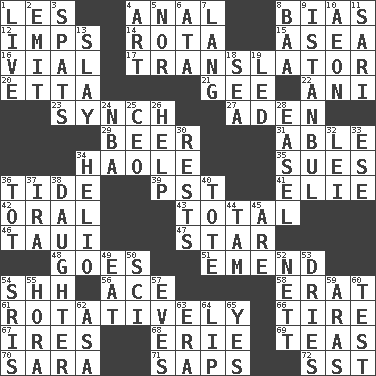 ACROSS 1. French article 4. Of or related to the anus 8. Prejudice 12. Naughty children 14. Roll call or roster of names 15. At sea 16. Small bottle 17. Interpreter 20. Singer James 21. Unit of force equal to gravity 22. Cuckoo 23. Synchronize (abbr.) 27. Arabian gulf 29. Fermented drink made from hops 31. Competent 34. White Person, in Hawaii 35. Institutes legal proceedings 36. Periodic rise and fall of the sea level 39. Pacific Standard Time (abbr.) 41. Writer Wiesel 42. Taken by mouth 43. "_____ Recall" 46. "Change" in Tahitian 47. Play the lead 48. Leaves 51. Make improvements or corrections to 54. Quiet! 56. Adept person 58. Part of Q.E.F. 61. Rotating or pertaining to rotation 66. Become fatigued 67. Angers 68. One of the Great Lakes 69. Beverages made from leaves 70. "Two Mules for Sister ____" 71. Plant excrements 72. Fast jet (abbr.) DOWN 1. Not recorded 2. Give off 3. Arguments over trivial matters 4. Nonscientific branch of learning 5. Not either 6. "One Day ___ Time" 7. Long (Scottish) 8. Sound made by sheep 9. Byzantium, centuries later 10. Age 11. Indian skirt 13. Kill 18. Ocean 19. Directed 24. Basketball assoc. 25. Corporate head (abbr.) 26. Aid 28. Artist's stand 30. Musical pauses 32. Flowery wreath 33. Compass dir. 34. Sun: prefix 36. Small child 37. Lyricist Gershwin 38. Female child 40. Carryall 44. Scottish cap 45. "We ___ not amused" (Victoria) 49. Consume 50. _-fi 52. Remaining after all deductions 53. Frees from moisture 54. Indian titles of respect 55. Israeli folk dance 57. Nights before holidays 59. Caspian sea tributary 60. Trial 62. White ___ sheet 63. Epoch 64. Mouth edge 65. Affirmative reply