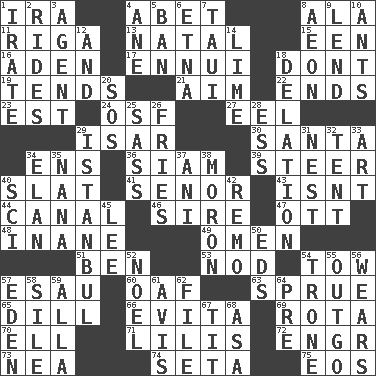ACROSS 1. Retirement account (abbr.) 4. Collude with 8. In the manner of 11. Capital of Latvia 13. Brizilian seaport 15. Car or cant ending 16. An important port of Yemen 17. World-weariness 18. Do not 19. Looks after 21. Direct toward a target or goal 22. Extremities 23. Eastern Standard Time (abbr.) 24. Order of Saint Francis (abbr.) 27. Snakelike fish 29. Austrian river, tributary to the Danube 30. Before Barbara or Clara 34. Followers of ems 36. Thailand, formerly 39. Bull 40. Narrow board 41. Sir (Sp.) 43. Is not 44. Lessep's creation 46. Father 47. Baseball player Mel 48. Lacking in sense or substance 49. Sign of something about to happen 51. Benjamin's nick name 53. Allow head to fall sleepily 54. Pull behind 57. He sold his birthright 60. Clumsy lout 63. Upset 65. Deli pickle 66. Webber/Rice musical 69. Roll call or roster of names 70. Pipe bend 71. Ms. Damita and namesakes 72. Engineer (abbr.) 73. Teachers' org. 74. Stalk of a moss capsule 75. Greek goddess of the dawn DOWN 1. Feeling or showing extreme anger 2. Amusement-park features 3. Representative 4. A saturated hydrocarbon 5. Forbid 6. Inactive volcano in Sicily 7. "Change" in Tahitian 8. Period of immesurable duration 9. Grant temporary use of 10. Pismires 12. Added to 14. Welles in "The Third Man" 18. Accusation by an informer 20. Distress signal 25. Backtalk 26. Strips of potato fried in deep fat 28. Curvy letter 29. Byzantium, centuries later 31. A home for chicks 32. Portable shelter 33. Tate display 34. Liveliness 35. Grandmother 37. Cuckoo 38. Person of subnormal intelligence 40. _-fi 42. San ____ (Riviera town) 45. Area sheltered from the wind 50. Begley and Asner 52. Christmas carol 54. Marketplace scale 55. Money paid out 56. Puts on (as clothing) 57. Genesis locale 58. Drop; flow; fall 59. Silent film actress Nazimova 61. Deliberation 62. Do some clerical work 64. Before (prefix) 67. Teat (slang) 68. White ___ sheet