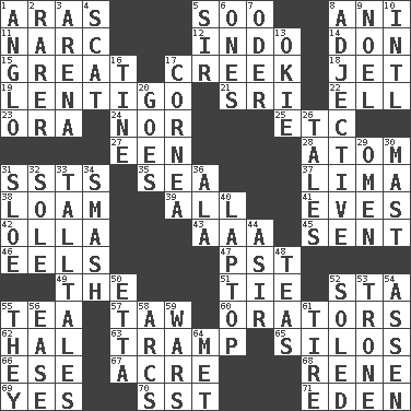 ACROSS 1. Ancient river in northeast Turkey 5. "Barney Miller" actor Jack 8. Black tropical American cuckoo 11. Drug cop 12. Southeast Asian peninsula 14. Spanish title 15. Relatively large 17. Small stream 18. _ stream 19. Small, flat, pigmented spot on the skin 21. Indian title of respect (Mr.) 22. Pipe bend 23. Mouth or opening 24. Or not 25. And so on (abbr.) 27. Car or cant ending 28. Tiny particle 31. Fast planes 35. Ocean 37. Pale green bean 38. Rich soil 39. 100% 41. Nights before holidays 42. Water jar 43. American Automobile Association (abbr.) 45. Transmitted 46. Snakelike fish 47. Pacific Standard Time (abbr.) 49. Definite Article 51. Neckwear 52. R.R. building 55. Beverage made from leaves 57. The 23rd letter of the Hebrew alphabet 60. Speakers 62. Actor Linden 63. _____ steamer (cargo ship) 65. Grain storage towers 66. Compass dir. 67. Land measure 68. French philosopher Descartes 69. Consenting reply 70. Fast jet (abbr.) 71. Locale of original sin DOWN 1. White American of non-Hispanic descent 2. More valued for its uncommonness 3. Sports stadium 4. Get outta here! 5. Title for a knight 6. Washington bills 7. Baltic tributary 8. Descriptive word 9. Christmas carol 10. International (abbr.) 13. Migrant worker of the '30s 16. Prong on a fork 17. Pupil covering 20. Leaves 26. Falsehoods 29. Presage 30. Vertical spar for supporting sails 31. A type of plum 32. Flatfish 33. Baron Munchausen's specialties 34. Box-office sellout 36. According to 40. Portable computer 44. SW Saudi Arabia district 48. Beverages made from leaves 50. Singer James 52. Having a sole or soles 53. Marketplace scale 54. NE Netherlands city 55. Those things 56. Relaxation 58. Curves 59. Armed conflicts 61. Hoop that covers a wheel 64. Was introduced to