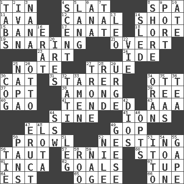 ACROSS 1. Metal container 4. Narrow board 8. Health resort 11. Actress Gardner 12. Lessep's creation 14. Opportunity 15. Object of repulsion 17. Related on the mother's side 18. Old wives' tales, e.g. 19. Catching in a trap 21. Unconcealed 23. Nonscientific branch of learning 24. Binary compound 25. Make mention of 27. Loyal 30. Domesticated feline 31. A viewer who gazes fixedly 34. Baseball player Mel 37. Elect 38. Amid 39. Portuguese money of account (variant) 40. E Mali city 41. Watched over 43. American Automobile Association (abbr.) 44. Trig term 45. Charged atoms 47. Raised railways 49. Grand Old Party 50. Move like a hungry wolf 52. Inhabiting a nest 56. Strained 57. Bert's buddy 60. Portico 61. South American Indian 62. Purposes of endeavors 63. Uncastrated adult male sheep 64. Eastern Standard Time (abbr.) 65. Double curve, resembling the letter S 66. Single DOWN 1. Bar bills 2. "Terrible" tsar 3. Grandmother 4. Odor 5. Long (Scottish) 6. Santa ___, CA 7. Make lace 8. Dinah or Pauly 9. Left side of a ship or aircraft 10. Had dinner 13. Lion 14. Downhill vehicle 16. Part of Q.E.F. 20. Angers 22. Compete 25. California wine valley 26. "Beetle Bailey" pooch 27. Heavy duty weighing machine 28. Tear apart 29. Goad 30. Gear tooth 32. Jacques of French films 33. So be it 34. NW Algerian seaport 35. Afternoon social gatherings 36. Beverage made from leaves 42. "Vaya con ____" 44. Compass dir. 46. Chooses 47. Spew [out] 48. Globular water bottle used in Asia 49. Honkers 50. Zero-star reviews 51. Part of a journey 52. Mediterranean tributary 53. "Tell ____ the Marines!" 54. Part of speech 55. Yawn 56. Make a knot 58. Friend of Pooh 59. Tired old horse