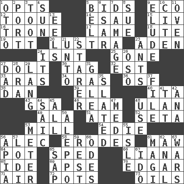 ACROSS 1. Chooses 5. Auction offers 9. Environmental prefix 12. Woman's close-fitting hat 14. Son of Isaac 15. 54 in ancient Rome 16. Marketplace scale 17. Unable to walk 18. Shoshoni 19. Baseball player Mel 20. A period of five years 23. Arabian gulf 24. Is not 25. Went 27. Dunce 30. Label 32. Eastern Standard Time (abbr.) 33. Ancient river in northeast Turkey 34. Mouths or openings 36. Order of Saint Francis (abbr.) 38. Daniel's nick name 39. Pipe bend 40. Call ___ day 43. Girls' org. (abbr.) 46. 480, 500 or 516 sheets of paper 48. ____ Bator 49. According to 51. Had dinner 52. Bristle 53. Place where flour is made 54. Singer Brickell 56. Actor Baldwin 58. Eats (away) 61. Informal term for the mouth 64. Cooking vessel 65. Moved rapidly 66. Woody, climbing, usually tropical plant 68. Binary compound 69. Domed church section 70. _ Allan Poe 71. Atmosphere 72. Cooking vessels 73. Petroleums DOWN 1. Von Bismarck 2. Sweet dark-red dessert wine 3. A blast of a horn 4. Player for Phoenix 5. Waist strap 6. Austrian river, tributary to the Danube 7. Break 8. Take to court 9. Dodge 10. Quote 11. Baking chamber 13. Snakelike fish 21. To (old English) 22. A viewer who gazes fixedly 23. Pismires 24. It is 26. Bear (Spanish) 27. Male parent 28. Mouth or opening 29. Long (Scottish) 31. An organ shaped like a helmet 35. Scheduled 37. Do some clerical work 41. Make lace 42. Santa ___, CA 44. Ketch in the Levant 45. Everything 47. Ancient Persian 48. Purpose 50. City in Syria 53. Distance measurement 55. Small island 56. Capital of Western Samoa 57. Farming town in central California 59. Repose 60. Lyric poems 61. Wise men 62. Of or related to the anus 63. Armed conflicts 65. Plant excrement 67. Wedding promise