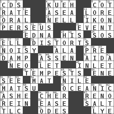 ACROSS 1. Music discs 4. Malaysian steamed pastry 8. Small bed 11. Assign a rank or rating to 13. At sea 14. Old wives' tales, e.g. 15. Relating to the mouth 16. 1994 drama film starring Jodie Foster 17. Picture 18. Son of Zeus who helped slay Medusa 21. Incident 22. Pulitzer Prize-winning author Ferber 23. Part of HMS, perhaps 25. Mayday 26. Pipe bend 29. What propaganda does 32. Annoyingly loud 34. Wing 35. Before (prefix) 38. Moist 39. NE Netherlands city 41. Opera by Verdi 43. Modern: prefix 44. Allow 45. An arm off of a larger body of water 46. Storms 50. Compass dir. 51. Perceive with the eye 54. Floor covering 55. The longest river in the world 57. Taiwanese island in East China Sea 59. Pertaining to the sea 63. American tennis player Robert 64. "Mermaids" star 67. Western Nevada city 68. It's straight from the horse's mouth 69. Comfort 70. Table seasoning 71. Affectionate concern, for short 72. Lyric poems 73. Sodium hydroxide DOWN 1. Riding implement 2. Have the gumption 3. Play the lead 4. Sunflower state 5. Purpose 6. Snakelike fish 7. Actor Linden 8. Popular sodas 9. U. of Maine site 10. Portable shelters 12. Otherwise 14. 54 in ancient Rome 19. Whirlpool 20. Single; one (prefix) 21. Eastern Standard Time (abbr.) 23. Hollow 24. SW Asia republic 26. Conclusion 27. Grant temporary use of 28. Welles in "The Third Man" 30. Clothes sense 31. Connect, as a bridge 33. Blemish 36. Cause heat under the collar 37. Locale of original sin 39. _ mater 40. Back-to-school mo. 42. Had dinner 45. Capri or Wright 47. Australian flightless bird 48. Sounds asleep 49. Nervous spasm 51. Don Adams' spy role 52. Artist's stand 53. Value system 56. Hearing organs 58. Elected rep. 60. Anneal 61. Inwardly 62. ____ d'Azur (French Riviera) 64. Corporate head (abbr.) 65. Possessed 66. Compass dir.