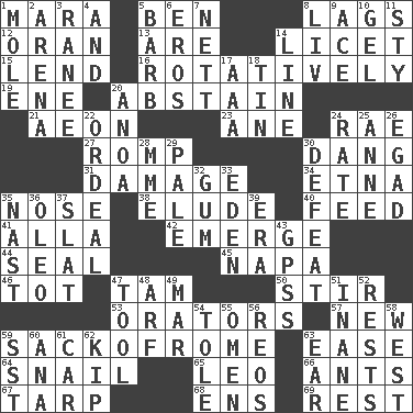 ACROSS 1. Hindu Mythology: god of death 5. Benjamin's nick name 8. Falls behind 12. Northwest Algerian city 13. "We ___ not amused" (Victoria) 14. It is permitted: Lat. 15. Grant temporary use of 16. Rotating or pertaining to rotation 19. Compass dir. 20. Refrain by choice 21. Period of immesurable duration 23. One (Scot) 24. Actress Charlotte 27. Frolic 30. Mild oath, euphamism for damn 31. Break 34. Inactive volcano in Sicily 35. Sense of smell 38. Dodge 40. Nourish 41. Silent film actress Nazimova 42. Develop 44. Lick closed 45. California wine valley 46. Small child 47. Scottish cap 50. Tumult 53. Speakers 57. ___ Haven, CT 59. Italian handbag shop? 63. Comfort 64. Slow-paced one 65. Lion 66. Pismires 67. Canvas cover 68. Followers of ems 69. Repose DOWN 1. Undercover agent 2. Sports stadium 3. Indian princess (variant) 4. Plus 5. Sharp remark 6. Greek god of love 7. Remaining after all deductions 8. 54 in ancient Rome 9. Adept person 10. Set 11. Filthy place 14. Actor's bit 17. American Automobile Association (abbr.) 18. Shallow baking pan 20. Small Philippine buffalo 22. Severe or trying experience 24. Assign a rank or rating to 25. Queen of England 1702-14 26. Mild oath 28. Madame (abbr.) 29. Light colored 30. Outscore 32. Chewing product 33. Locale of original sin 35. Political cartoonist Thomas 36. Butter sub 37. Narrow board 39. Period 43. Global Positioning Systems (abbr.) 47. Instrument 48. Sandy's bark 49. Spoil 51. Silly 52. Musical pauses 54. Lacquered or enameled metalware 55. Sign of something about to happen 56. Vintage cars 58. 270 degrees 59. Fast jet (abbr.) 60. Santa ___, CA 61. 4-wheeled motor vehicle 62. Monetary unit of Laos 63. Hearing organ