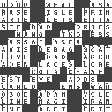 ACROSS 1. Scent 5. Welt 9. White ___ sheet 12. To erase 13. Capri or Wright 14. Demure 15. Johnson of "Laugh-In" 16. Allows 17. Singer James 18. Perceive with the eye 19. Movie disc 21. Frees from moisture 22. Billionth: prefix 24. Ring climax 26. Double-curved letter 27. Slender Brazilian palm 28. Toward the sea 29. Deliberation 30. Debunk (Brit. slang) 32. Get outta here! 36. Not recorded 37. June honoree 38. Bowlike part 39. Arabian gulf 40. Shoestrings 42. Old wives' tales, e.g. 43. Root beer relative 44. Desist 46. Eastern Standard Time (abbr.) 49. Sight organ 50. Sums up 51. Monte _, Las Vegas Hotel/Casino 53. Followers of ems 54. Armed conflict 57. Mitch Miller's instrument 58. First of billions? 61. Short-tailed, large-bodied rat 62. Actor's bit 63. Wise men 64. SW Asia republic 65. Compass dir. 66. Collude with 67. Prepare for publication DOWN 1. Mouths or openings 2. Have the gumption 3. Clearly or manifestly demonstrative 4. Portuguese money of account (variant) 5. Uncontrolled 6. Compass dir. 7. Keyboard modifier key 8. French article 9. Nick name for Arthur 10. Settings 11. Collect or gather 14. For each 19. Heredity factor (abbr.) 20. Empty area or space 21. ___ good deed 23. NE Netherlands city 24. Sadhe (variant) 25. Barrel 27. Enthusiastic 28. Phillipine bananalike plant 29. In the manner of 31. Peak District village in England 32. First course 33. What you're doing now 34. 1/640 square mile 35. Definite Article 40. Myrna of the movies 41. Glance over 43. Corporate head (abbr.) 45. Begley and Asner 46. Learning spot: Fr. 47. Unit of acoustic absorption 48. Heavy duty weighing machine 52. Area sheltered from the wind 53. Send forth 55. Jai _ 56. Monthly bill 58. Wet nurse (var.) 59. Pat or tap gently 60. Mature 61. Compete