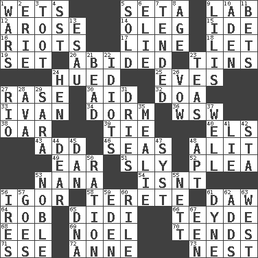 ACROSS 1. Moistens 5. Stalk of a moss capsule 9. Experiment locale 12. Came up 14. Cassini of fashion 15. Binary compound 16. Debaucheries 17. Actor's bit 18. Allow 19. Arrange properly for use 20. Remained 23. Airtight sealed metal containers 24. Became colored 25. Nights before holidays 27. Raze (variant) 30. Help 32. ___ good deed 33. "Terrible" tsar 34. Dormintory (informal) 36. Compass dir. 38. Rowing implement 39. Standoff 40. Raised railways 43. Say or write further 46. Oceans 48. Set down 49. Ewer handle 51. Secret 52. Entreaty 53. Nanny 54. Is not 56. Russian composer Stravinsky 58. Cigar-shaped 61. Fool 64. Director Reiner 65. "You Light Up My Life" star Conn 66. Miss Universe 1986, Barbara Palacios _ 68. Snakelike fish 69. Christmas carol 70. Looks after 71. Compass dir. 72. Queen of England 1702-14 73. A home for chicks DOWN 1. Armed conflicts 2. One of the Great Lakes 3. A blast of a horn 4. Fast jet (abbr.) 5. Exchanged or delivered for money 6. Writer Wiesel 7. Looked after 8. Ripen 9. Ms. Damita and namesakes 10. An important port of Yemen 11. Stakes 13. Son of Isaac 21. Necklace unit 22. Foolish or stupid persons 23. Beverages made from leaves 24. Layer 26. Solemn pledge 27. River (Sp.) 28. Actress Gardner 29. "Two Mules for Sister ____" 31. Frees from moisture 35. Ear of corn 37. Not ill 41. Whopper 42. R.R. building 44. Letter starter 45. One of the 12 tribes of Israel 47. System (abbr.) 48. Fitting 50. Food allowance for one day 53. Impressive in appearance 55. Remaining after all deductions 56. Angers 57. Moves 59. Genesis locale 60. Cause heat under the collar 61. Unit of force 62. Does sums 63. Compass direction 65. Heredity factor (abbr.) 67. Car or cant ending