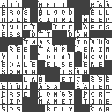 ACROSS 1. Small island 4. Waist strap 8. Sound made by sheep 11. Greek god of love 13. Vital fluid 15. Pipe bend 16. Hero or heavy, e.g. 17. High-altitude cloud 18. Shed a tear 19. An arm off of a larger body of water 21. Frozen water 22. Arches 23. Double-curved letter 24. Baseball player Mel 27. Spanish title 29. It was, poetically 30. Potato state 34. To sift 36. Pack (down) 39. Soviet premier 1918-24 40. Shout 41. Standard of perfection 43. Be footloose 44. Peak District village in England 46. Otherwise 47. Compass dir. 48. Underwater navigation system 49. Russian ruler of old 51. Experiment locale 53. And so on (abbr.) 54. Compass dir. 57. Needle holder 60. White ___ sheet 63. Ingested 65. Celtic language 66. Yearns 69. Sweet dark-red dessert wine 70. Mouth edge 71. French painter Edouard 72. Hoop that covers a wheel 73. Mayday 74. Have trust in 75. 4-wheeled motor vehicle DOWN 1. Nest on high 2. Metal shackles 3. For Whom the Bell _____ 4. English channel? 5. Biblical high priest 6. Australian parrot (variant) 7. Torque (variant) 8. Fermented drink made from hops 9. Actor Baldwin 10. High mountains 12. Observe 14. Passed on 18. Roamer 20. Pull behind 25. Jacques of French films 26. Sadhe (variant) 28. Petroleum 29. Copy Pinocchio 31. Soon (poet.) 32. Hub of activity 33. Single 34. Redecorate 35. Enthusiasm 37. Cartoonist voice _ Blanc 38. Thick mixture 40. Affirmative reply 42. For fear that 45. Period 50. Adept person 52. Lip ointment 54. Unemotional 55. Father Junipero _ 56. Keyboard key 57. Snakelike fish 58. Musical group of three 59. United States Postal Service (abbr.) 61. Fly high 62. Singer Murray 64. Fitting 67. Set 68. Filthy place