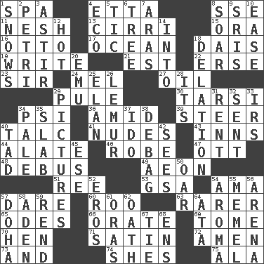 ACROSS 1. Health resort 4. Singer James 8. Compass dir. 11. Delicate 13. High-altitude cloud 15. Mouth or opening 16. "Beetle Bailey" pooch 17. Sea 18. Raised platform 19. Compose 21. Eastern Standard Time (abbr.) 22. Celtic language 23. Title for a knight 24. Cartoonist voice _ Blanc 27. Lubricate 29. Whine 30. Tarsus (plural) 34. 23rd letter of the Greek alphabet 36. Among 39. Navigate 40. Baby powder 41. Unadorned figures 43. Restaurants 44. Having winglike extensions 46. Loose flowing garment 47. Baseball player Mel 48. To get out of a bus 49. Age 51. Portuguese money of account (variant) 53. Girls' org. (abbr.) 54. Nursemaid (var.) 57. Have the gumption 60. Friend of Pooh 63. More uncommon 65. Lyric poems 66. Declaim 69. Heavy book 70. Layer 71. Smooth fabric 72. So be it 73. Added to 74. "______ My Girl" (Turtles hit) 75. Insect wing DOWN 1. Frozen precipitation (plural) 2. _ dish (used to culture cells) 3. Moving about 4. Environmental prefix 5. Nervous spasm 6. Family _ (genealogy) 7. Caspian sea tributary 8. Fly high 9. Indian titles of respect 10. Comfort 12. Being at a high temperature 14. To the inside or interior of 18. Accusation by an informer 20. Australian flightless bird 25. Flair 26. Arboreal primate 28. ___ a Wonderful Life 29. Photos 31. Monthly bill 32. Emitted 33. Big collection agency 34. Diluted with white 35. Broad, flat, thick piece 37. Wedding promise 38. Debunk (Brit. slang) 40. Bit 42. Perceives with the eye 45. Compass dir. 50. Boat paddle 52. Greek god of love 54. Odor 55. Klaipeda city 56. Sports stadium 57. Capital of the state of Qatar 58. An important port of Yemen 59. Tear apart 61. Mouths or openings 62. Pledge 64. _ moment's notice (2 wds.) 67. Standoff 68. Followers of ems