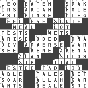 ACROSS 1. Lion 4. Eroded 9. Neighbor of Neb. 13. Big collection agency 14. Believer in; advocate of (suffix) 15. Opening into or through something 16. Pacific Standard Time (abbr.) 17. Wash lightly 18. Cassini of fashion 19. Snakelike fish 21. Compass dir. 22. Snake scale 24. Anneal 26. Car dealer's back yard 27. Trials 29. Moistens 30. Get up 31. Wrote a lyric poem 33. Heredity factor (abbr.) 36. HTML Container Element 37. Contrary to your interests or welfare 40. Armed conflict 41. Perceive with the eye 42. French philosopher Descartes 43. Sports stadium 45. ____ Jay Lerner 47. Grain storage towers 48. Small drink 49. Slanted text style (abbr.) 50. First name in cosmetics 52. Small amount or degree 54. Flaplike covering 56. Competent 57. Lies 59. Fish or hair follower 61. Fly high 62. Assad's deity 63. Slender fish 64. Pismires 65. Calif. Air Force Base 66. _ Lanka DOWN 1. Mouth edge 2. Celtic language 3. Clearly or manifestly demonstrative 4. Hearing organ 5. Satellite of Uranus 6. Canisters 7. Relaxation 8. Compass dir. 9. Yells 10. Stupid person 11. Toward shelter 12. Cask 20. Allows 22. Bobsleighs 23. Small bed 25. At sea 27. Small amounts or degrees 28. One of the Great Lakes 29. Past tense of be (plural) 31. Baking chamber 32. Lair 33. Homes 34. Billionth: prefix 35. Caspian sea tributary 38. Window treatment 39. Compass direction 44. Monetary unit of Yemen 45. Michaelmas daisies 46. Whopper 49. Standard of perfection 50. Inky black, to poets 51. Narrow board 52. Story 53. Silent film actress Nazimova 55. Letter starter 56. White ___ sheet 57. Keyboard key 58. A female animal or person 60. Three (prefix)