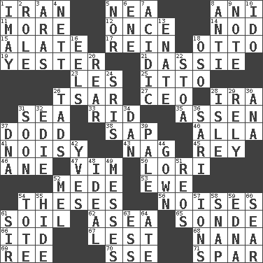 ACROSS 1. SW Asia republic 5. Teachers' org. 8. Black tropical American cuckoo 11. Greater amount 12. At one time in the past 14. Allow head to fall sleepily 15. Having winglike extensions 17. It's straight from the horse's mouth 18. "Beetle Bailey" pooch 19. Of or pertaining to yesterday 21. Hyrax 23. French article 25. "Tell ____ the Marines!" 26. Russian ruler of old 27. Corporate head (abbr.) 28. Lyricist Gershwin 31. Ocean 33. To free from 35. NE Netherlands city 37. Texas town _ City 38. Plant excrement 40. Silent film actress Nazimova 41. Annoyingly loud 43. Tired old horse 45. Marina Del _, California 46. A saturated hydrocarbon 47. Zeal 50. Australian parrot (variant) 52. Ancient Persian 53. She-sheep 54. College papers 56. Annoying sounds 61. The visible part of the earth's surface 62. At sea 65. Something which is sent 66. It would 67. For fear that 68. Nanny 69. To separate or throw off 70. Compass dir. 71. Practice fight DOWN 1. "If ____ say so..." 2. Hero or heavy, e.g. 3. Ancient river in northeast Turkey 4. Remaining after all deductions 5. And not 6. Compass dir. 7. Being or containing an acid 8. Opposed to 9. Musical sound 10. Wedding promise 13. Related on the mother's side 16. Snakelike fish 18. Bear (Spanish) 20. Located in or toward the back 22. Portico 24. Indian titles of respect 26. Small amounts or degrees 28. Small island 29. Trust 30. Santa ___, CA 31. Within a short period 32. Singer Brickell 34. Daniel's nick name 36. Indian skirt 37. Heredity factor (abbr.) 39. Diluted with white 42. Jacques Cousteau's middle name 44. Woman's formal wear 48. Perfect 49. Makes clutter 51. Vintage cars 52. Cartoonist voice _ Blanc 54. Lug 55. Flintstone garb 57. Charged atoms 58. Fastener 59. Pulitzer Prize-winning author Ferber 60. Shrivel 61. Title for a knight 63. Curvy letter 64. Had dinner