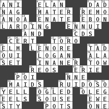 ACROSS 1. Black tropical American cuckoo 4. Liveliness 8. Male parent 11. Tired old horse 12. Mother 14. San ____ (Riviera town) 15. Small Philippine buffalo 17. Maternal 18. Inky black, to poets 19. Preparing or cooking with lard 21. World-weariness 23. Added to 24. Music discs 25. Sure thing 27. "Corrida" creature 30. Shade tree 31. Poe poem 34. Bit 37. Fr. "Yes" 38. Utah city north of Ogden 39. Insect wing 40. Arrange properly for use 41. More lacking in sense or substance 43. Pull behind 44. Vintage cars 45. 4th largest of the Great Lakes 47. Luau course 49. Compass dir. 50. Unmarried girls 52. Boisterous (Brazilian Portuguese) 56. Shout 57. Stared 60. Cassini of fashion 61. Snakelike fish 62. Lush 63. She-sheep 64. Filthy place 65. Cooking vessels 66. Single DOWN 1. Of or related to the anus 2. Nanny 3. Composer Stravinsky 4. Make improvements or corrections to 5. Austrian-born American filmmaker Fritz 6. _ moment's notice (2 wds.) 7. Fish or hair follower 8. Alight from a bus 9. Mine, in Marseilles 10. Spanish title 13. To sift 14. Tear apart 16. The sixth month of the Jewish calendar 20. International (abbr.) 22. Non-commissioned officer (abbr.) 25. A slight indication 26. Give off 27. Ancient Roman robes 28. Northwest Algerian city 29. French philosopher Descartes 30. Greek goddess of the dawn 32. Writer Wiesel 33. Words to Nanette 34. Jacques of French films 35. Medicinal plant 36. Obsolete 42. Painter Guido (1575-1642) 44. To free from 46. Redecorate 47. Friendly 48. Lubricates 49. Unadorned figures 50. Rendezvous 51. Mayday 52. State of inaction 53. Butter sub 54. Stitched 55. Double curve, resembling the letter S 56. It is so 58. Grand Old Party 59. Nilotic language