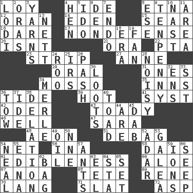 ACROSS 1. Myrna of the movies 4. Flintstone garb 8. Inactive volcano in Sicily 12. NW Algerian seaport 14. Paradise 15. Dry up 16. Have the gumption 17. Unrelated to defense, as in spending 20. Is not 21. Mouth or opening 22. Parent Teacher Assoc. 23. Remove all contents or possession from 27. Singer Murray 29. Relating to the mouth 31. Washington bills 34. With motion or animation 35. Taverns 36. Event that recurs at intervals 39. Being at a high temperature 41. System (abbr.) 42. River in Europe 43. Sycophant 46. Water source 47. "Two Mules for Sister ____" 48. Period of immesurable duration 51. Debunk (Brit. slang) 54. Fish or hair follower 56. _ tizzy (2 wds.) 58. Raised platform 61. The property of being fit to eat 66. Medicinal plant 67. Small Philippine buffalo 68. Wig 69. French philosopher Descartes 70. Austrian-born American filmmaker Fritz 71. Narrow board 72. Viper DOWN 1. Farming town in central California 2. Mouths or openings 3. Entertaining tales 4. Layer 5. Wedding promise 6. Lair 7. Inside; within (prefix) 8. Compass dir. 9. 3-inch nail 10. Political cartoonist Thomas 11. Type of rug 13. Remaining after all deductions 18. Epoch 19. Air blower 24. Friend of Pooh 25. Big collection agency 26. Romantic infatuation 28. Annoyingly loud 30. Plunders 32. Followers of ems 33. Fast jet (abbr.) 34. Haggard of country music 36. Pull behind 37. Binary compound 38. Conveyance 40. Frog relative 44. "We ___ not amused" (Victoria) 45. Small moist lump or mass 49. Petroleum 50. Compass dir. 52. The sixth month of the Jewish calendar 53. An organ shaped like a helmet 54. Anneal 55. Pulitzer Prize-winning author Ferber 57. Pismires 59. Charged atoms 60. Ooze 62. Paper or plastic container 63. Snakelike fish 64. R.R. building 65. Put into a specified state