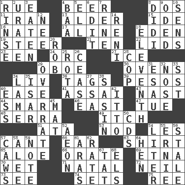 ACROSS 1. Sorrow 4. Fermented drink made from hops 8. Two (Sp.) 11. SW Asia republic 13. Tree or shrub in the Birch family 15. Binary compound 16. Nathan's nickname 17. Place in a line 18. Genesis locale 19. Guide 21. "___ Little Indians" 22. Flaplike coverings 23. Car or cant ending 24. The grampus (Milton) 27. Frozen water 29. Mitch Miller's instrument 30. Baking chambers 34. 54 in ancient Rome 36. Labels 39. Mexican monetary units 40. Relaxation 41. Slender Brazilian palm 43. Political cartoonist Thomas 44. Excessive but superficial compliments 46. 90 degrees 47. Third day of the wk. 48. Spanish missionary in California 49. Hankering 51. "One Day ___ Time" 53. Dreamland 54. French article 57. Patter 60. Hearing organ 63. Upper-body garment 65. _ vera 66. Declaim 69. Inactive volcano in Sicily 70. Dripping 71. Brizilian seaport 72. Famous astronaut Armstrong 73. Observe 74. Arranges properly for use 75. To separate or throw off DOWN 1. Wash lightly 2. A salt of uric acid 3. Eroded 4. Sound made by sheep 5. Pipe bend 6. Prepare for publication 7. French philosopher Descartes 8. "You Light Up My Life" star Conn 9. Wrote a lyric poem 10. Elected reps. 12. Born 14. Painter Guido (1575-1642) 18. Veterans Day date 20. Director Reiner 25. Round or rotation of duties 26. Stop 28. Police officer (slang) 29. Make much ado about nothing 31. Son of Isaac 32. Characteristic smell of wine 33. Fast jet (abbr.) 34. Unable to walk 35. Austrian river, tributary to the Danube 37. Girls' org. (abbr.) 38. Indian antelope 40. Double-curved letter 42. "Tell ____ the Marines!" 45. Floor covering 50. Music discs 52. A really long time 54. 61 cubic inches 55. Bert's buddy 56. Lacking originality or spontaneity 57. Crow sounds 58. Toward shelter 59. Brief written record 61. Ancient river in northeast Turkey 62. Assign a rank or rating to 64. Layer 67. Make lace 68. Raised railways