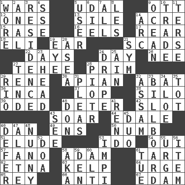 ACROSS 1. Armed conflicts 5. Allodial 9. Baseball player Mel 12. Singles 13. Drop; flow; fall 14. 43,560 square feet 15. Raze (variant) 16. Snakelike fish 17. Posterior 18. Biblical high priest 19. Ewer handle 21. Tons 22. 24-hour periods 24. 24 hours 26. Born 27. Giggle 28. Demure 29. French philosopher Descartes 30. Bee-related 32. Blind as ____ 36. South American Indian 37. Chop off 38. Grain storage tower 39. Wrote a lyric poem 40. Prevent from occurring 42. Groove 43. Fly high 44. Peak District village in England 46. One of the 12 tribes of Israel 49. Followers of ems 50. Unfeeling 51. Evade 53. Wedding promise 54. Fr. "Yes" 57. Papal veil 58. First man 61. Small pie 62. Inactive volcano in Sicily 63. Seaweed 64. Goad 65. Marina Del _, California 66. Opposed to 67. Dutch treat DOWN 1. Had on 2. Of or related to the anus 3. Home 4. Compass dir. 5. One who uses or employs something 6. Expire 7. Everything 8. French article 9. Sea 10. Buy and sell 11. Laconic 14. Curve 19. Sight organ 20. At sea 21. Symbol (abbr.) 23. Having the leading position 24. Window treatment 25. The 18th letter of the Arabic alphabet 27. Look after 28. Peter (Polish) 29. River (Sp.) 31. Entreaties 32. Indian state 33. Big road sign 34. Medicinal plant 35. Small child 40. Spanish title 41. Tear apart 43. Perceive with the eye 45. Superhero pair 46. Postpone 47. Having winglike extensions 48. Pet term 52. ___ good deed 53. Body of Kaffir warriors 55. Capital and largest city of Mongolia 56. A whole individual unit 58. Alias (abbr.) 59. Lair 60. The first octave above the treble staff 61. Third day of the wk.