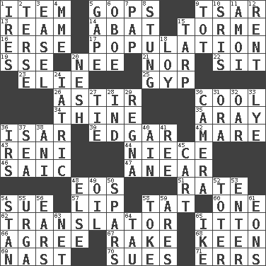 ACROSS 1. A distinct part 5. Republicans 9. Russian ruler of old 13. 480, 500 or 516 sheets of paper 14. Blind as ____ 15. Singer Mel 16. Celtic language 17. Census information 19. Compass dir. 20. Born 21. Not either 22. Be seated 23. Writer Wiesel 25. Flimflam 26. Being in motion 30. Calm and collected 34. One or ones belonging to thee 35. Like ___ of sunshine 36. Austrian river, tributary to the Danube 39. _ Allan Poe 42. Female horse 43. Painter Guido (1575-1642) 44. Sibling's daughter 46. Ketch in the Levant 47. Approach 48. Greek goddess of the dawn 51. Pace 54. Take to court 57. Mouth edge 58. Make lace 60. Single 62. Interpreter 65. "Tell ____ the Marines!" 66. Match 67. Libertine 68. Peachy ____! 69. Political cartoonist Thomas 70. Takes to court 71. Blunders DOWN 1. Angers 2. Laconic 3. Artist's stand 4. Madame (abbr.) 5. Open wide 6. Mitch Miller's instrument 7. Infant food 8. Feeling sharp psychological pain 9. Small child 10. Indian titles of respect 11. Mine, in Marseilles 12. Monthly bill 15. Canvas cover 18. Myrna of the movies 20. Delicate 24. Of or pertaining to medicine 27. Neckwear 28. Working for oneself (abbr.) 29. Rain (Swedish) 30. Device for capturing images 31. Mouth or opening 32. Rowing implement 33. Sodium hydroxide 36. Big collection agency 37. Ocean 38. Cuckoo 40. The 18th letter of the Arabic alphabet 41. Portuguese money of account (variant) 45. Draw slowly or heavily 48. Otherwise 49. Lubricate 50. Practice fights 52. Carrier 53. Keyboard key 54. Comedian Laurel of Laurel & Hardy 55. Capital and largest city of Mongolia 56. Hearing organs 58. Casino tip 59. Ancient Greek god of war 61. Immeasurably long periods of time 63. Fish or hair follower 64. The 19th letter of the Greek alphabet 65. Mamie's mate