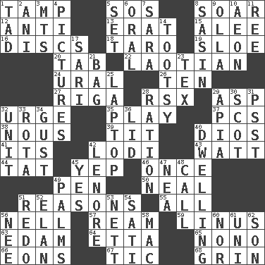 ACROSS 1. Pack (down) 5. Mayday 8. Fly high 12. Opposed to 13. Part of Q.E.F. 15. Toward shelter 16. Plates 18. Pacific island yam 19. _ gin 20. Bar bill 22. Of or relating to Laos or its people 24. Mountain range 26. Nine, plus one 27. Port city in Latvia 28. Acura sports coupe 29. Cleo's killer 32. Goad 35. Frolic 37. Personal Computers (abbr.) 38. Common sense 39. Teat (slang) 40. "Vaya con ____" 41. ___ a Wonderful Life 42. Farming town in central California 43. Electrical Unit 44. Make lace 45. Slangy assent 46. At one time in the past 49. Animal enclosure 50. Actress Patricia 51. Thinks logically 55. Everything 56. 1994 drama film starring Jodie Foster 57. 480, 500 or 516 sheets of paper 59. "_ and Lucy" (Charlie Brown theme song) 63. Dutch treat 64. Singer James 65. Words to Nanette 66. Immeasurably long periods of time 67. Nervous spasm 68. Broad smile DOWN 1. Small boy 2. Cuckoo 3. Mountains (abbr.) 4. Photos 5. Arrange properly for use 6. Relating to the mouth 7. "Two Mules for Sister ____" 8. Indian antelope 9. Rounded earthenware pot or jar 10. Period of immesurable duration 11. To riddle 14. A girl or young woman (variant) 17. Indian skirt 21. Container for groceries 23. John Ritter's dad 25. Portable computer 28. Food allowance for one day 29. Capital of Western Samoa 30. Native of Scotland 31. Inconspicuous attention getter 32. A single undivided whole 33. Roll call or roster of names 34. Abrupt rush of wind 36. Hat (slang) 40. Home 42. Poe poem 45. It is so 47. Teachers' org. 48. Give a ring to 49. Insides of hands 51. Make new 52. Liveliness 53. Remaining after all deductions 54. Suttee (variant) 56. Born 58. Big _ 60. Or not 61. University (slang) 62. Manchild