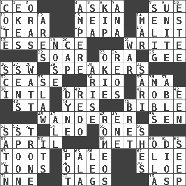 ACROSS 1. Corporate head (abbr.) 4. "____ silly question..." 8. Institute legal proceedings 11. Gumbo ingredient 13. Chow _ 14. Not women's 15. Pull apart 16. Dad 17. Set down 18. Gist 21. Compose 22. Fly high 23. Mouth or opening 25. Unit of force equal to gravity 26. Compass dir. 29. Orators 32. Desist 34. _ de Janeiro 35. Housemaid (var.) 38. International (abbr.) 39. Frees from moisture 41. Loose flowing garment 43. R.R. building 44. Affirmative reply 45. God's Word 46. Nomad 50. Elected rep. 51. Fast jet (abbr.) 54. Lion 55. Singles 57. Showery time 59. Modes 63. A blast of a horn 64. Diluted with white 67. Writer Wiesel 68. Charged atoms 69. Butter sub 70. A type of plum 71. Compass dir. 72. Labels 73. Cleo's killer DOWN 1. ____ d'Azur (French Riviera) 2. Supplements with great effort 3. Mouths or openings 4. Electrical Unit 5. Ocean 6. Sleep 7. Santa ___, CA 8. Former Milwaukee Brewers owner Bud 9. Join together 10. First name in cosmetics 12. Ancient Greek god of war 14. Third mo. 19. Sense of smell 20. Head covering 21. Armed conflict 23. Migrant worker of the '30s 24. Vintage cars 26. _-fi 27. Elected reps. 28. Electrical Unit 30. Originate 31. Indian skirt 33. Cole _ (cabbage dish) 36. Disorderly crowds 37. Competent 39. Unit of force 40. Make new 42. Car or cant ending 45. Cy Young winner Saberhagen 47. Everything 48. Lover boys 49. Compass dir. 51. Smooth fabric 52. Soup utensil 53. Heavy duty weighing machine 56. "______ My Girl" (Turtles hit) 58. ___ a Wonderful Life 60. Spanish pot 61. "Vaya con ____" 62. Ooze 64. Plant holder 65. According to 66. Part of a journey