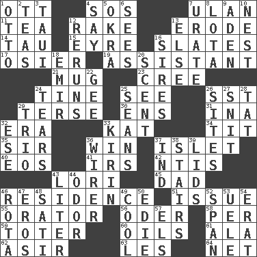 ACROSS 1. Baseball player Mel 4. Distress signal 7. Uhlan (variant) 11. Beverage made from leaves 12. Immoral or dissolute person 13. Eat (away) 14. The 19th letter of the Greek alphabet 15. Jane of fiction 16. Chalkboards 17. Flexible twig of a willow tree 19. Helper 21. Java container 23. Algonquian 24. Prong on a fork 25. Perceive with the eye 26. Fast jet (abbr.) 29. Laconic 30. Followers of ems 31. _ tizzy (2 wds.) 32. Epoch 33. Krazy ___ of comics 34. Teat (slang) 35. Title for a knight 36. Acquire through effort 37. Small island 40. Greek goddess of the dawn 41. Big collection agency 42. Nuclear Threat Initiatives 43. Australian parrot (variant) 45. Male parent 46. Home 51. Come out of 55. Speaker 56. River in Europe 58. For each 59. Carrier 60. Lubricates 61. Insect wing 62. SW Saudi Arabia district 63. French article 64. Fish or hair follower DOWN 1. Von Bismarck 2. Afternoon social gatherings 3. "Change" in Tahitian 4. Declare 5. Gumbo ingredient 6. Observes 7. A salt of uric acid 8. Globular water bottle used in Asia 9. An important port of Yemen 10. Egg locale 12. Summer TV shows 13. Otherwise 16. Begets 18. Independent ruler or chieftain 20. Odor 22. Unit of force equal to gravity 24. Rends 25. Actors Connery and Penn 26. Locates 27. In a ____ (agitated or irritated) 28. Make lace 29. Musical group of three 32. Compass dir. 33. Japanese brewing company 36. One who wires 37. Indiana (abbr.) 38. Flight of steps 39. Flaplike coverings 43. 61 cubic inches 44. Aroma 46. Round or rotation of duties 47. Greek god of love 48. Suttee (variant) 49. Calm and collected 50. Singer Brickell 52. Connect, as a bridge 53. Ubangi River tributary 54. Part of Q.E.F. 57. Raised railways