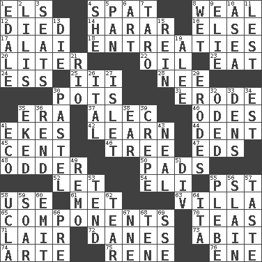 ACROSS 1. Raised railways 4. Argument over a trivial matter 8. Welt 12. Passed on 14. Ethiopian city, capital of Harari 16. Otherwise 17. Jai _ 18. Pleas 20. 61 cubic inches 22. Petroleum 23. Ingest 24. Curvy letter 25. One more than two 28. Born 30. Cooking vessels 31. Wear away 35. Epoch 37. Actor Baldwin 40. Lyric poems 41. Makes supply last 42. Memorize 44. Incision 45. Penny 46. Relationship diagram 47. Begley and Asner 48. More peculiar 50. Groovy apts. 52. Allow 54. Connecticut Ivy Leaguer 55. Pacific Standard Time (abbr.) 58. Purpose 61. Was introduced to 63. Country estate 65. Parts 70. Afternoon social gatherings 71. Den 72. Natives or inhabitants of Denmark 73. "This won't hurt ____!" 74. Johnson of "Laugh-In" 75. French philosopher Descartes 76. Compass dir. DOWN 1. Peak District village in England 2. Ms. Damita and namesakes 3. Theater features 4. A female animal or person 5. Baking dish 6. Tate display 7. Edible starchy tuberous root 8. Dripping 9. Writer Wiesel 10. Toward the sea 11. For fear that 13. Pass on 15. It's straight from the horse's mouth 19. Toward shelter 21. _ de Janeiro 26. Slanted text style (abbr.) 27. Small island 29. Eats (away) 30. Soft color 32. Wrote a lyric poem 33. Hiding places for outlaws 34. Eastern Standard Time (abbr.) 35. Made supply last 36. Tear apart 38. Ewer handle 39. Streamer paper 41. Environmental prefix 43. Anneal 49. San ____ (Riviera town) 51. HTML Container Element 53. Be inclined (to) 55. First-year military academy student 56. Killed 57. Clothes sense 58. Southern CA. univ. 59. Fly high 60. Send forth 62. Separate forcefully 64. Call ___ day 66. Before (prefix) 67. Compass dir. 68. Nine, plus one 69. Compass dir.