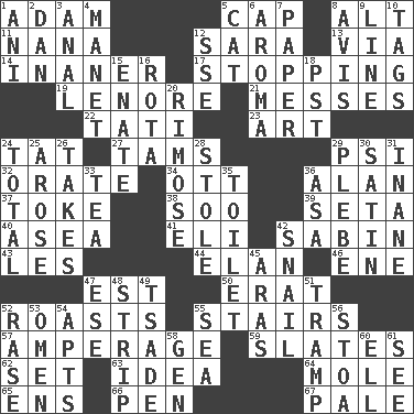 ACROSS 1. First of billions? 5. Head covering 8. The first octave above the treble staff 11. Nanny 12. "Two Mules for Sister ____" 13. By way of 14. More lacking in sense or substance 17. Ceasing 19. Poe poem 21. Makes clutter 22. Jacques of French films 23. Tate display 24. Make lace 27. Scottish caps 29. 23rd letter of the Greek alphabet 32. Declaim 34. Baseball player Mel 36. Actor Alda or Thicke 37. Casino tip 38. "Barney Miller" actor Jack 39. Stalk of a moss capsule 40. Toward the sea 41. Biblical high priest 42. Unit of acoustic absorption 43. French article 44. Flair 46. Compass dir. 47. Eastern Standard Time (abbr.) 50. Part of Q.E.F. 52. Cooks with dry heat, as in an oven 55. Flight of steps 57. Electrical Measurement 59. Chalkboards 62. Put into a specified state 63. It may be bright or harebrained 64. Undercover agent 65. Followers of ems 66. Fenced enclosure 67. Light colored DOWN 1. Cuckoo 2. One of the 12 tribes of Israel 3. Of or related to the anus 4. French painter Edouard 5. Feline 6. Odor 7. Some stationery 8. Opinion 9. Actor's bit 10. Labels 12. Compass dir. 15. Related on the mother's side 16. Roll call or roster of names 18. Pacific Standard Time (abbr.) 20. Full of chinks, cracks, or crevices 24. Add up to 25. Came up 26. Receives possession of 28. Fur scarf 29. Military trainee 30. Smooth fabric 31. Empty; void 33. Afternoon social gathering 35. Bathroom 36. White ___ sheet 42. Slow-paced one 45. Caspian sea tributary 47. Compass dir. 48. Long narrow piece of something 49. Sadhe (variant) 51. _____ steamer (cargo ship) 52. To erase 53. Sign of things to come 54. Flats, for short 55. Ocean 56. Portico 58. Commissioned mil. rank 60. Pipe bend 61. Perceive with the eye