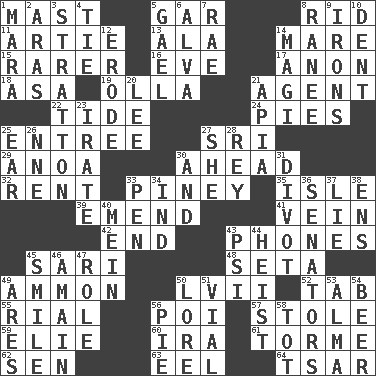 ACROSS 1. Vertical spar for supporting sails 5. Slender fish 8. To free from 11. Nick name for Arthur 13. In the manner of 14. Female horse 15. Less widely known 16. First lady 17. Soon (poet.) 18. White ___ sheet 19. Water jar 21. Representative 22. Event that recurs at intervals 24. Sliced desserts 25. Main course 27. Indian title of respect (Mr.) 29. Small Philippine buffalo 30. Forward in time 32. Monthly bill 33. Abounding in pines 35. Capri or Wright 39. Make improvements or corrections to 41. Distinctive style or manner 42. Conclude 43. Gives a jingle 45. Indian skirt 48. Bristle 49. ID or VA city 50. 57 in ancient Rome 52. Keyboard key 55. Monetary unit of Yemen 56. Luau course 57. Took without asking 59. Writer Wiesel 60. Lyricist Gershwin 61. Singer Mel 62. Elected rep. 63. Snakelike fish 64. Russian ruler of old DOWN 1. Hindu Mythology: god of death 2. Ancient river in northeast Turkey 3. Ski resort town in Vermont 4. Standoff 5. Highlander 6. Inventor's middle name 7. Actress Charlotte 8. Indian princess (variant) 9. Removes the wrinkles 10. Incision 12. Eat (away) 14. Wise men 20. Area sheltered from the wind 21. Capital of Western Samoa 23. Feeling or showing extreme anger 25. Ewer handle 26. Compass dir. 27. A female animal or person 28. Marina Del _, California 30. Added to 31. A piece of turf (Scot.) 33. Fenced enclosure 34. Working for oneself (abbr.) 36. Legislators 37. Untruth 38. Followers of ems 40. Chow _ 43. 23rd letter of the Greek alphabet 44. Robbery 45. Grin 46. At full speed 47. Hero or heavy, e.g. 49. Ancient Greek god of war 50. Old wives' tales, e.g. 51. Small bottle 53. _ mater 54. Fermented drink made from hops 56. Sliced dessert 58. Small child