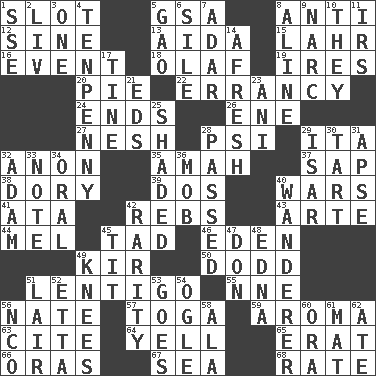 ACROSS 1. Groove 5. Girls' org. (abbr.) 8. Opposed to 12. Trig term 13. Opera by Verdi 15. Cowardly lion portrayer 16. Happening 18. Norwegian king 19. Angers 20. Sliced dessert 22. The state or an instance of erring 24. Conclusions 26. Compass dir. 27. Soft 28. 23rd letter of the Greek alphabet 29. Call ___ day 32. At once, immediately (arch.) 35. Nanny 37. Plant excrement 38. Dinghy 39. Two (Sp.) 40. Armed conflicts 41. _ moment's notice (2 wds.) 42. Confederate soldiers (slang) 43. Johnson of "Laugh-In" 44. Cartoonist voice _ Blanc 45. Small amount or degree 46. Locale of original sin 49. Apertif with cassis 50. Texas town _ City 51. Small, flat, pigmented spot on the skin 55. Compass dir. 56. Nathan's nickname 57. Ancient Roman robe 59. Odor 63. Quote 64. Shout 65. Part of Q.E.F. 66. Mouths or openings 67. Ocean 68. Assign a rank or rating to DOWN 1. Compass dir. 2. 54 in ancient Rome 3. Single 4. 3-inch nail 5. E Mali city 6. Filth; sediment 7. The sixth month of the Jewish calendar 8. Place in a line 9. Drug cop 10. Those people 11. Big collection agency 14. Anew 17. Prong on a fork 21. Begley and Asner 23. Cuckoo 25. Cast a shadow over 28. Went by 29. Austrian river, tributary to the Danube 30. Small pie 31. Domed church section 32. First man 33. Musical sound 34. Of the mouth 36. Disorderly crowd 40. Nomad 42. Noteworthy scarcity 45. Teat (slang) 47. Spanish title 48. Pulitzer Prize-winning author Ferber 49. Leg joints 51. Den 52. Singer James 53. Moves 54. Stare 56. Non-commissioned officer (abbr.) 58. In the manner of 60. Mouth or opening 61. Floor covering 62. Had dinner
