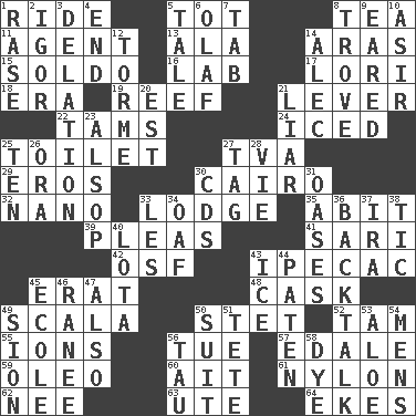 ACROSS 1. Travel on or in a vehicle 5. Small child 8. Beverage made from leaves 11. Representative 13. Wing 14. Caspian sea tributary 15. Twentieth part of a lira 16. Experiment locale 17. Australian parrot (variant) 18. Epoch 19. Coral collection 21. Crowbar 22. Scottish caps 24. On the rocks 25. Bathroom 27. Federal power corp. 29. Greek god of love 30. Capital of Egypt 32. Billionth: prefix 33. Inn 35. "This won't hurt ____!" 39. Entreaties 41. Indian skirt 42. Order of Saint Francis (abbr.) 43. Medicinal drug used to evoke vomiting 45. Part of Q.E.F. 48. Keg 49. Any of the three canals of the cochlea 50. Proofreading order 52. Scottish cap 55. Charged particles 56. Third day of the wk. 57. Peak District village in England 59. Margarine 60. Small island 61. Thermoplastic polyamide 62. Born 63. Shoshoni 64. Supplements with great effort DOWN 1. Raze (variant) 2. Composer Stravinsky 3. Conveyance 4. Conclude 5. Story 6. Norwegian king 7. Bar bill 8. Collection of objects 9. Having ears or earlike features 10. SW Saudi Arabia district 12. Singer Mel 14. Actor Baldwin 20. Eastern Standard Time (abbr.) 21. One who doesn't tell the truth 23. Columnist Joseph or Stewart 25. Nine, plus one 26. Mouth or opening 27. Label 28. Compete 30. Music discs 31. Fertile tracts in a desert 33. French article 34. Clumsy lout 36. Sass 37. Lyricist Gershwin 38. Nervous spasm 40. Globular water bottle used in Asia 43. Frozen water 44. Eucharist need 45. Learning spot: Fr. 46. The wife of a rajah (variant) 47. In addition 49. The Jewish people; Israel 50. Set or collection 51. Wig 53. _ vera 54. Not women's 56. The 19th letter of the Greek alphabet 58. Color