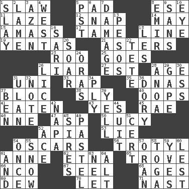 ACROSS 1. Cole _ (cabbage dish) 5. Writing tablet 8. Compass dir. 11. Goldbrick 12. Fastener 14. Can I? 15. Collect or gather 17. Docile 18. Actor's bit 19. Gossips 21. Michaelmas daisies 23. Friend of Pooh 25. Travels 26. One who doesn't tell the truth 27. Eastern Standard Time (abbr.) 28. Mature 31. Corn or form start 33. Hit sharply and swiftly 35. Ferber et al. 37. Coalition 38. Stealthy 40. I made a mistake 41. Ingested 43. It is so 45. Actress Charlotte 46. Compass dir. 47. Viper 50. "I Love _" 52. Capital of Western Samoa 53. Falsehood 54. Motion picture awards 56. TNT 61. Queen of England 1702-14 62. Inactive volcano in Sicily 65. Collection of objects 66. Non-commissioned officer (abbr.) 67. Sew up the eyelids of hawks and falcons 68. Ripens 69. Morning condensation 70. Allow 71. Political cartoonist Thomas DOWN 1. Kill 2. Unable to walk 3. Muslim summons to prayer 4. Compass direction 5. Pacific Standard Time (abbr.) 6. Santa ___, CA 7. Break 8. Arab leader 9. Without 10. Sight organ 13. Mexican monetary units 16. Indian skirt 18. French article 20. Fly high 22. False hair 24. Mouths or openings 26. Louse (plural) 28. Small Philippine buffalo 29. Yawn 30. Curvy letter 31. ____ Bator 32. Brief written record 34. Apply oneself diligently 36. Rowboat 37. Benjamin's nick name 39. Shout 42. California wine valley 44. Costume for a special activity 48. Founders of families 49. Soft color 51. Foregone conclusion 52. Adept person 54. Single time 55. Frozen precipitation 57. NW Algerian seaport 58. Ancient Roman robe 59. Jacques Cousteau's middle name 60. For fear that 61. Also 63. Born 64. Keyboard modifier key