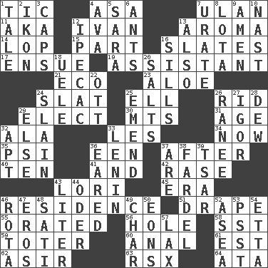 ACROSS 1. Nervous spasm 4. White ___ sheet 7. ____ Bator, Mongolia 11. Alias (abbr.) 12. _ the terrible 13. Odor 14. Chop off 15. Piece 16. Chalkboards 17. Take place subsequently 19. Helper 21. Environmental prefix 23. Medicinal plant 24. Narrow board 25. Pipe bend 26. To free from 29. Opt 30. Mountains (abbr.) 31. Ripen 32. According to 33. French article 34. Immediately 35. Air pressure measure (abbr.) 36. Car or cant ending 37. Following 40. "___ Little Indians" 41. Also 42. Raze (variant) 43. Australian parrot (variant) 45. Period 46. Home 51. Window treatment 55. Declaimed 56. Opening into or through something 58. Fast jet (abbr.) 59. Carrier 60. Of or related to the anus 61. Eastern Standard Time (abbr.) 62. SW Saudi Arabia district 63. Acura sports coupe 64. "One Day ___ Time" DOWN 1. Story 2. Visual representation of an object 3. Balmoral and tarboosh 4. Actress Gardner 5. "Two Mules for Sister ____" 6. Pismires 7. A salt of uric acid 8. Globular water bottle used in Asia 9. So be it 10. Political cartoonist Thomas 12. Medicinal drug used to evoke vomiting 13. In addition 16. Beverly of Met fame 18. Ubangi River tributary 20. Table seasonings 22. Baseball player Mel 24. Killed 25. Make improvements or corrections to 26. The wife of a rajah (variant) 27. Composer Stravinsky 28. Morning condensation 29. Otherwise 32. Fitting 33. Soviet premier 1918-24 36. Having ears or earlike features 37. "We ___ not amused" (Victoria) 38. Bundle 39. Russian ruler of old 43. 61 cubic inches 44. Baltic tributary 46. Round or rotation of duties 47. Greek god of love 48. Suttee (variant) 49. Burn to charcoal 50. Immeasurably long periods of time 52. At sea 53. Inconspicuous attention getter 54. Singer James 57. Not strict