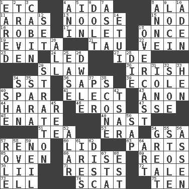 ACROSS 1. And so on (abbr.) 4. Opera by Verdi 8. Wing 11. Caspian sea tributary 13. Trap for birds or small mammals 15. Dreamland 16. Loose flowing garment 17. An arm off of a larger body of water 18. Single time 19. Webber/Rice musical 21. The 19th letter of the Greek alphabet 22. Distinctive style or manner 23. Lair 24. Directed 27. Binary compound 29. Cole _ (cabbage dish) 30. From or relating to Ireland 34. Fast jet (abbr.) 36. Plant excrements 39. Learning spot: Fr. 40. Practice fight 41. Opt 43. At once, immediately (arch.) 44. Ethiopian city, capital of Harari 46. Greek god of love 47. Compass dir. 48. Related on the mother's side 49. Political cartoonist Thomas 51. Afternoon social gathering 53. Epoch 54. Girls' org. (abbr.) 57. Former U.S. Attorney General Janet 60. Hat (slang) 63. Actors' quests 65. Baking chamber 66. Originate 69. Vintage cars 70. Cards in a Roman deck? 71. Musical pauses 72. Lie 73. Pipe bend 74. Scram! 75. "___ Little Indians" DOWN 1. Having ears or earlike features 2. Collection of objects 3. Apartment or room in a ship 4. Black tropical American cuckoo 5. Electrically charged atom 6. Stupid person 7. At sea 8. Singer Murray 9. Venues 10. Arabian gulf 12. Arrange properly for use 14. Needle holder 18. Cloudy 20. Everything 25. Relaxation 26. A sleeping potion; an opiate (poet.) 28. Pass on 29. Ski resort town in Vermont 31. Charged atoms 32. A type of plum 33. Layer 34. Connect, as a bridge 35. "Two Mules for Sister ____" 37. For each 38. Biscuitlike quick bread 40. A female animal or person 42. Russian ruler of old 45. Portuguese money of account (variant) 50. Plant excrement 52. Having or resembling wings 54. Relatively large 55. Fur scarf 56. NE Netherlands city 57. Hero or heavy, e.g. 58. Tending to cause great harm 59. Famous astronaut Armstrong 61. Angers 62. Compact _ 64. Nonscientific branch of learning 67. R.R. building 68. Eastern Standard Time (abbr.)
