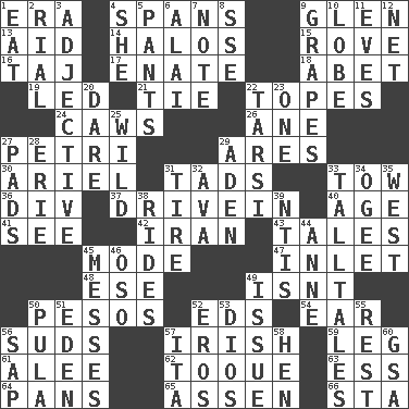 ACROSS 1. Period 4. Connects, as a bridge 9. Small, secluded valley 13. Assist 14. Auras 15. Be footloose 16. _ Mahal 17. Related on the mother's side 18. Collude with 19. Directed 21. Make a knot 22. Drinks excessively 24. Crow sounds 26. One (Scot) 27. _ dish (used to culture cells) 29. Ancient Greek god of war 30. Satellite of Uranus 31. Bits 33. Pull behind 36. HTML Container Element 37. Popular '50s hangout 40. Mature 41. Observe 42. SW Asia republic 43. Lies 45. Method 47. An arm off of a larger body of water 48. Compass dir. 49. Is not 50. Mexican monetary units 52. Begley and Asner 54. Hearing organ 56. Soap bubbles 57. From or relating to Ireland 59. Part of a journey 61. Toward shelter 62. Woman's close-fitting hat 63. Double-curved letter 64. Baking dishes 65. NE Netherlands city 66. R.R. building DOWN 1. Ingest 2. Monetary unit of Yemen 3. Descriptive word 4. A female animal or person 5. Leg coverings 6. Mountain range southwest of Kyrgyzstan 7. Musical sound 8. Compass dir. 9. Raisin fruits 10. Ear part 11. Nights before holidays 12. Fish or hair follower 20. Have the gumption 22. Tarsus (plural) 23. Single 25. Uncontrolled 27. Groovy apts. 28. One of the Great Lakes 29. Arabian gulf 31. Hoop that covers a wheel 32. Actress Gardner 33. Baron Munchausen's specialties 34. Double curve, resembling the letter S 35. 270 degrees 38. Amusement-park features 39. Nuclear Threat Initiatives 44. Queen of England 1702-14 45. Makes clutter 46. Bear (Spanish) 49. Come out of 50. Monetary unit of Botswana 51. Genesis locale 52. Greek god of love 53. "Vaya con ____" 55. Remainder 56. Plant excrement 57. Call ___ day 58. Layer 60. Girls' org. (abbr.)