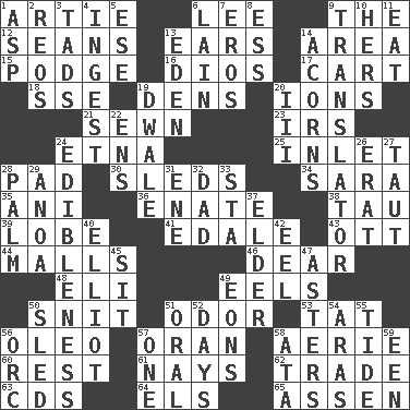 ACROSS 1. Nick name for Arthur 6. Area sheltered from the wind 9. Definite Article 12. Actors Connery and Penn 13. Hearing organs 14. Type of rug 15. Plash 16. "Vaya con ____" 17. Draw slowly or heavily 18. Compass dir. 19. Lairs 20. Charged particles 21. Stitched 23. Big collection agency 24. Inactive volcano in Sicily 25. An arm off of a larger body of water 28. Writing tablet 30. Bobsleighs 34. "Two Mules for Sister ____" 35. Black tropical American cuckoo 36. Maternal 38. The 19th letter of the Greek alphabet 39. Ear part 41. Peak District village in England 43. Baseball player Mel 44. Shopping centers 46. Letter starter 48. Biblical high priest 49. Snakelike fish 50. In a ____ (agitated or irritated) 51. Scent 53. Make lace 56. Margarine 57. Northwest Algerian city 58. Nest on high 60. Respite 61. Negative votes 62. Buy and sell 63. Music discs 64. Raised railways 65. NE Netherlands city DOWN 1. Cleo's killer 2. Vintage cars 3. Small amounts or degrees 4. Consume 5. Compass dir. 6. (Had) reclined 7. Greek god of love 8. Double-curved letter 9. Interpreter 10. Possessive pronoun 11. Erode 13. Paradise 14. Oak nuts 19. A sleeping potion; an opiate (poet.) 20. One more than two 22. Followers of ems 24. The property of being fit to eat 26. Part of Q.E.F. 27. Tense 28. Inside of hand 29. Small Philippine buffalo 31. Compass dir. 32. Male parent 33. R.R. building 37. A person who is older than you are 40. American author Paul (1891-1958) 42. Snakelike fish 45. Be seated 47. Michaelmas daisies 49. Immeasurably long periods of time 50. Downhill vehicle 51. Of the mouth 52. 24-hour periods 54. Ancient river in northeast Turkey 55. Event that recurs at intervals 56. The grampus (Milton) 57. Single 58. "One Day ___ Time" 59. Car or cant ending