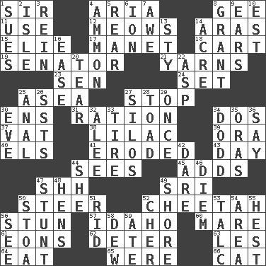 ACROSS 1. Title for a knight 4. Roberta Peters solo 8. Turn to the right 11. Purpose 12. Catcalls? 14. Ancient river in northeast Turkey 15. Writer Wiesel 17. French painter Edouard 18. Heavy open wagon 19. Legislator 21. Entertaining tales 23. Elected rep. 24. Put into a specified state 25. Toward the sea 27. Constrict 30. Followers of ems 31. Food allowance for one day 34. Two (Sp.) 37. Large container 38. Pale purple color 39. Mouth or opening 40. Raised railways 41. Eaten away 43. 24 hours 44. Perceives with the eye 45. Sums up 47. Quiet! 49. Indian title of respect (Mr.) 50. Guide 52. Leopard's kin 56. Astound 57. Potato state 60. Female horse 61. Immeasurably long periods of time 62. Prevent from occurring 63. French article 64. Ingest 65. Past tense of be (plural) 66. Domesticated feline DOWN 1. Takes to court 2. Small island 3. It's straight from the horse's mouth 4. ID or VA city 5. Stern 6. Electrically charged atom 7. Deep reverence 8. Let have 9. Hearing organs 10. Eastern Standard Time (abbr.) 13. Filthy place 14. 43,560 square feet 16. Relaxation 20. Lacerate 22. Cleo's killer 25. Of or related to the anus 26. Fast planes 27. Grain storage towers 28. Frog relative 29. Single time 30. First lady 32. Toward shelter 33. Hoop that covers a wheel 34. Texas town _ City 35. Mouths or openings 36. Declare 42. Have the gumption 44. A female animal or person 46. South Vietnam president (1954) 47. Check the growth or development of 48. Coop moms 49. Dinah or Pauly 50. Portico 51. To free from 52. "Mermaids" star 53. Baby powder 54. Type of rug 55. Command 56. Perceive with the eye 58. Morning condensation 59. Had dinner