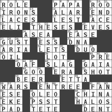 ACROSS 1. Hero or heavy, e.g. 5. Dad 9. Friend of Pooh 12. Metal shackles 14. Having or resembling wings 15. Conclude 16. Shoestrings 17. For fear that 18. Adept person 19. Biblical high priest 20. College papers 23. Nights before holidays 24. At sea 25. Comfort 27. Abrupt rush of wind 30. Curvy letter 32. Heredity factor (abbr.) 33. Operatic vocal solo 34. Allows 36. Superhero pair 38. Petroleum 39. Car dealer's back yard 40. Before (prefix) 43. Clumsy lout 46. Volcanic refuse 48. Greek goddess of the earth (variant) 49. Thick or sticky substance 51. Epoch 52. Went for two points 53. Fermented drink made from hops 54. Singer James 56. Armed conflicts 58. Main course 61. Avid follower 64. Compass dir. 65. Butter sub 66. Large country 68. Supplement with great effort 69. Inconspicuous attention getter 70. Saint headwear 71. Writing tablet 72. False hair 73. Gouge DOWN 1. Cause heat under the collar 2. Relating to the mouth 3. Event scenes 4. Compass dir. 5. Friends 6. Toward shelter 7. Went by 8. Nonscientific branch of learning 9. Rob, plunder, or pillage 10. Single time 11. Lyric poems 13. Fast planes 21. The bottom of a shoe or boot 22. Artist's stands 23. He sold his birthright 24. _ moment's notice (2 wds.) 26. Added to 27. E Mali city 28. RI univ. 29. Grain storage tower 31. Fur scarf 35. A viewer who gazes fixedly 37. Brightly colored fish 41. _ de Janeiro 42. Consume 44. Ripens 45. Enemy 47. Yard entry 48. Girls' org. (abbr.) 50. Threatening words 53. A special lineage 55. Georgia ____ (Atlanta school) 56. Shed a tear 57. "____ silly question..." 59. A home for chicks 60. Haul 61. Do some clerical work 62. At once, immediately (arch.) 63. Political cartoonist Thomas 65. Elect 67. Possessed