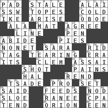 ACROSS 1. Groovy apt. 4. Showing deterioration from age 9. Mountain range southwest of Kyrgyzstan 13. Compass dir. 14. Drinks excessively 15. Chilled 16. Mamie's husband 17. Get up 18. Mitch Miller's instrument 19. According to 21. Floor protector 22. Match 24. Actor's bit 26. Writing instrument 27. Tolerate 29. Sliced desserts 30. Music written for nine 31. "Two Mules for Sister ____" 33. To free from 36. Label 37. Lacerating 40. Epoch 41. It is 42. To starve (Brit.) 43. Slender Brazilian palm 45. Went for two points 47. Aches 48. Actor Linden 49. Tear apart 50. Sadhe (variant) 52. Adept person 54. Put into a specified state 56. Alleged 57. Gives food to 59. Lower and raise head in agreement 61. A type of plum 62. The wife of a rajah (variant) 63. Tax preparer (abbr.) 64. Look after 65. Constellation of myth 66. Car or cant ending DOWN 1. Air pressure measure (abbr.) 2. "____ silly question..." 3. Residences 4. R.R. building 5. Singer Mel 6. Capital of Western Samoa 7. For fear that 8. Compass dir. 9. Oak nuts 10. Ear part 11. Medicinal plant 12. Binary compound 20. Helper 22. Bee-related 23. Turn to the right 25. Remaining after all deductions 27. Opposed to 28. Water vessel 29. Demure 31. Table seasoning 32. "We ___ not amused" (Victoria) 33. Dwelling 34. SW Asia republic 35. Raised platform 38. Learning spot: Fr. 39. Open wide 44. Without 45. Cast a shadow over 46. Possessed 49. Cowboy competition 50. Lie 51. The Jewish people; Israel 52. Lightbulb-shaped fruit 53. Painter Guido (1575-1642) 55. Drink excessively 56. Fast jet (abbr.) 57. Away 58. Elected rep. 60. One of the 12 tribes of Israel