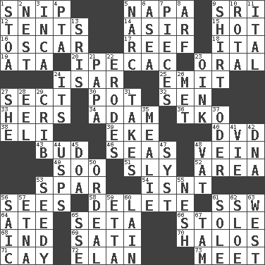 ACROSS 1. Clip 5. California wine valley 9. _ Lanka 12. Portable shelters 14. SW Saudi Arabia district 15. Being at a high temperature 16. Witty Wilde 17. Coral ridge 18. Call ___ day 19. _ moment's notice (2 wds.) 20. Medicinal drug used to evoke vomiting 23. Of the mouth 24. Austrian river, tributary to the Danube 25. Send forth 27. Religious group 30. Plant holder 32. Elected rep. 33. Possessive pronoun 34. First of billions? 36. Ring climax 38. Biblical high priest 39. Make supply last 40. Movie disc 43. Partially opened flower 46. Oceans 48. Distinctive style or manner 49. "Barney Miller" actor Jack 51. Wily 52. Type of rug 53. Coast Guard woman 54. Is not 56. Perceives with the eye 58. Erase 61. Compass dir. 64. Had dinner 65. Stalk of a moss capsule 66. Took without asking 68. Indiana (abbr.) 69. Suttee (variant) 70. Rings 71. Island 72. Style 73. Rendezvous DOWN 1. Portico 2. Egg locale 3. South American Indian 4. Parent Teacher Association (abbr.) 5. Drug cop 6. Toward the sea 7. Parts 8. Sandy's bark 9. Chest covering 10. Round or rotation of duties 11. Slanted text style (abbr.) 13. Indian titles of respect 21. Dad 22. Eats (away) 23. Pig sound 24. ___ a Wonderful Life 26. Was introduced to 27. A female animal or person 28. Snakelike fish 29. Baby bed with high sides 31. Proceeds 35. Ear of corn 37. Baltic tributary 41. Compete 42. Heredity factor (abbr.) 44. United States Postal Service (abbr.) 45. ___ good deed 47. System (abbr.) 48. Large container 50. Severe or trying experience 53. Morally degraded 55. Delicate 56. Ketch in the Levant 57. Inactive volcano in Sicily 59. Singer James 60. (Had) reclined 61. Flatfish 62. A type of plum 63. Compass direction 65. Compass dir. 67. Scottish cap