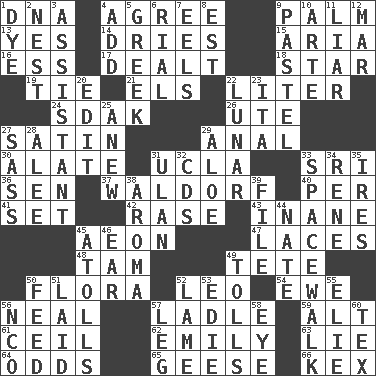 ACROSS 1. Heredity factor (abbr.) 4. Match 9. Inside of hand 13. It is so 14. Frees from moisture 15. Roberta Peters solo 16. Curvy letter 17. Started a card game 18. Play the lead 19. Standoff 21. Raised railways 22. 61 cubic inches 24. Neighbor of Neb. 26. Shoshoni 27. Smooth fabric 29. Of or related to the anus 30. Having winglike extensions 31. Southern CA. univ. 33. _ Lanka 36. Elected rep. 37. Apple salad 40. For each 41. Put into a specified state 42. To erase 43. Lacking in sense or substance 45. Age 47. Shoestrings 48. Scottish cap 49. Wig 50. Plants 52. Lion 54. She-sheep 56. Anneal 57. Dipping utensil 59. The first octave above the treble staff 61. To provide with a ceiling 62. Poet Dickinson 63. Falsehood 64. Probability 65. Honkers 66. A weed DOWN 1. Color 2. Egg locale 3. Aide 4. Say or write further 5. Hellenic 6. Monetary unit of Yemen 7. Snakelike fish 8. Eastern Standard Time (abbr.) 9. Soft color 10. Johnson of "Laugh-In" 11. One who doesn't tell the truth 12. Make imperfect 20. Prepare for publication 22. Type of eclipse 23. Call ___ day 25. Afresh 27. Backtalk 28. Toward shelter 29. _ vera 31. Uhlan (variant) 32. Music discs 33. High altitude stroll 34. French philosopher Descartes 35. Angers 38. Scent 39. Do some clerical work 44. Nathan's nickname 45. Ringlike coral islands and reefs 46. Hearing organ 49. For Whom the Bell _____ 50. Nourish 51. Put down 52. Unable to walk 53. Singer Brickell 55. Writer Wiesel 56. Non-commissioned officer (abbr.) 57. Part of a journey 58. Sight organ 60. John Ritter's dad
