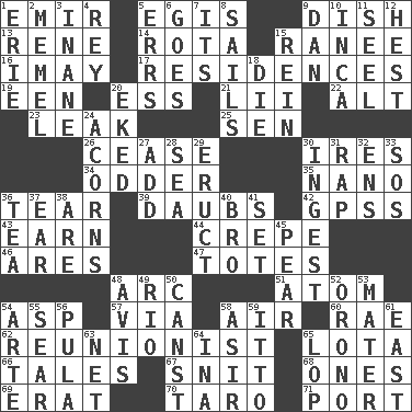 ACROSS 1. Arab leader 5. Armor plate that protects the chest 9. Food container 13. French philosopher Descartes 14. Round or rotation of duties 15. Indian princess (variant) 16. "If ____ say so..." 17. Homes 19. Car or cant ending 20. Double-curved letter 21. Cards in a Roman deck? 22. Keyboard modifier key 23. Path through which fluid escapes 25. Elected rep. 26. Desist 30. Angers 34. More peculiar 35. Billionth: prefix 36. Separate forcefully 39. Applies to a surface 42. Global Positioning Systems (abbr.) 43. Merit 44. Streamer paper 46. Ancient Greek god of war 47. Hauls 48. Curve 51. Tiny particle 54. Cleo's killer 57. By way of 58. Wind 60. Actress Charlotte 62. One who advocates reunion 65. Globular water bottle used in Asia 66. Falsehoods 67. In a ____ (agitated or irritated) 68. Washington bills 69. Part of Q.E.F. 70. Edible starchy tuberous root 71. Left side of a ship or aircraft DOWN 1. One of the Great Lakes 2. Klaipeda city 3. Silly 4. Marina Del _, California 5. Blunders 6. Leaves 7. It is 8. Travel by water 9. One of the 12 tribes of Israel 10. South American Indian 11. Stitch closed the eyes of (a falcon) 12. Command 15. It's straight from the horse's mouth 18. Expire 20. Made supply last 24. Oak nuts 27. Find the sum of 28. Ocean 29. Spew [out] 30. Eat 31. Reproach for some lapse or misdeed 32. Followers of ems 33. Distress signal 36. Beverage made from leaves 37. Ewer handle 38. "We ___ not amused" (Victoria) 40. Sis' sibling 41. Put into a specified state 45. Lightbulb-shaped fruit 48. Deliberation 49. River (Sp.) 50. 2nd pers. sing. pres. of can (arch.) 52. U. of Maine site 53. Mother 54. Johnson of "Laugh-In" 55. Scorch 56. Monetary unit of Botswana 58. SW Saudi Arabia district 59. "Tell ____ the Marines!" 61. 90 degrees 63. Fish or hair follower 64. _ tizzy (2 wds.) 65. Trim (branches)
