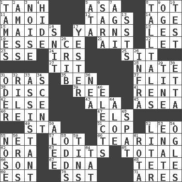 ACROSS 1. Hyperbolic tangent 5. White ___ sheet 8. Small child 11. Mine, in Marseilles 12. Labels 14. Mature 15. Unmarried girls 17. Tall tales 18. French article 19. Substance 21. Small island 22. Allow 23. Compass dir. 24. Big collection agency 25. Be seated 27. Teat (slang) 28. Nathan's nickname 31. Mouths or openings 35. Benjamin's nick name 37. Sudden quick movement 38. Compact _ 39. To sift 41. Monthly bill 42. Otherwise 43. In the manner of 45. At sea 46. It's straight from the horse's mouth 47. Raised railways 49. R.R. building 51. Police officer (slang) 52. Lion 55. Fish or hair follower 57. Car dealer's back yard 60. Pulling apart 62. Mouth or opening 63. Prepares for publication 65. "_____ Recall" 66. Male offspring 67. Pulitzer Prize-winning author Ferber 68. Wig 69. Eastern Standard Time (abbr.) 70. Fast jet (abbr.) 71. Ancient Greek god of war DOWN 1. Makes less strong or intense 2. Collect or gather 3. Annoying sound 4. Flintstone garb 5. _ moment's notice (2 wds.) 6. "Two Mules for Sister ____" 7. Hindu god of fire 8. Baron Munchausen's specialties 9. Double curve, resembling the letter S 10. Trial 13. Fast planes 16. In a ____ (agitated or irritated) 17. Last past 20. Baby bed with high sides 26. Kind of red light 29. Prong on a fork 30. Singer James 31. River in Europe 32. Cause heat under the collar 33. Aide 34. Aroma 36. Teachers' org. 40. Opts 44. _ vera 48. Argument over a trivial matter 50. Toward shelter 52. 61 cubic inches 53. Related on the mother's side 54. Stares 55. Olfactory organ 56. Greek god of love 58. Likelihood 59. Airtight sealed metal containers 61. Round or rotation of duties 64. Make lace