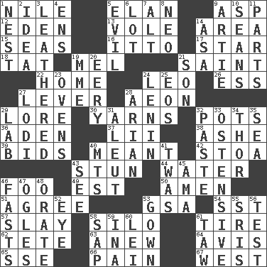 ACROSS 1. The longest river in the world 5. Style 9. Cleo's killer 12. Locale of original sin 13. Short-tailed, large-bodied rat 14. Length times width 15. Oceans 16. "Tell ____ the Marines!" 17. Play the lead 18. Make lace 19. Cartoonist voice _ Blanc 21. Virtuous person 22. Dwelling 24. Lion 26. Curvy letter 27. Crowbar 28. Age 29. Old wives' tales, e.g. 30. Entertaining tales 32. Cooking vessels 36. Arabian gulf 37. Cards in a Roman deck? 38. American tennis player Robert 39. Auction offers 40. Intended 42. Portico 43. Astound 44. Wetness 46. Egg _ yung 49. Eastern Standard Time (abbr.) 50. So be it 51. Match 53. Girls' org. (abbr.) 54. Fast jet (abbr.) 57. Kill 58. Grain storage tower 61. Hoop that covers a wheel 62. False hair 63. Afresh 64. Advice 65. Compass dir. 66. Ache 67. 270 degrees DOWN 1. A home for chicks 2. The content of cognition 3. Tough but pliablecoriaceous 4. Followers of ems 5. Morally bad or wrong 6. Car dealer's back yard 7. Keyboard modifier key 8. Modern: prefix 9. Nick name for Arthur 10. Seines 11. Actors' quests 14. White ___ sheet 19. Madame (abbr.) 20. Suggestive of the supernatural 21. Manchild 23. Baking chambers 24. Soviet premier 1918-24 25. Greek goddess of the dawn 27. Farming town in central California 28. Believer in; advocate of (suffix) 29. Experiment locale 31. Eskimo relative 32. Thick mixture 33. Clearly or manifestly demonstrative 34. Son of Odin 35. Ocean 40. Mountains (abbr.) 41. It was, poetically 43. Perceive with the eye 45. Housemaid (var.) 46. Goes without food and/or water 47. Stares at amorously 48. Declaim 52. Sight organ 53. Woman's formal wear 55. Indian titles of respect 56. Trial 58. Plant excrement 59. _ tizzy (2 wds.) 60. Flowery wreath 61. The 23rd letter of the Hebrew alphabet