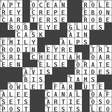 ACROSS 1. Fitting 4. Sea 9. Hero or heavy, e.g. 13. Marina Del _, California 14. Streamer paper 15. Inky black, to poets 16. Auto 17. Laconic 18. Loose flowing garment 19. Director Reiner 21. Sight organ 22. Adhesives 24. Keg 26. The 18th letter of the Arabic alphabet 27. Poet Dickinson 29. High mountains 30. "The Thinker" sculptor 31. Jane of fiction 33. Three (prefix) 36. Indian title of respect (Mr.) 37. Leopard's kin 40. Boat paddle 41. Car or cant ending 42. Otherwise 43. Declaim 45. Opinion 47. Amusement-park features 48. Twice 49. Scottish caps 50. A small or young owl 52. At a great distance 54. Shoshoni 56. Toward shelter 57. Lessep's creation 59. Clumsy lout 61. Puts into a specified state 62. Nick name for Arthur 63. Bear (Spanish) 64. Mail 65. Trials 66. Lion DOWN 1. Curve 2. Lightbulb-shaped fruit 3. Polypeptide antibiotic 4. Sep. follower 5. Small stream 6. Suggestive of the supernatural 7. Domed church section 8. Born 9. Summer TV shows 10. Mitch Miller's instrument 11. Tennis shots 12. Compass dir. 20. Indonesian resort city 22. An organ shaped like a helmet 23. Mouth edge 25. Synchronize (abbr.) 27. Celtic language 28. Greater amount 29. Johnson of "Laugh-In" 31. Snakelike fish 32. Consenting reply 33. Inedible or poisonous agaric 34. Assign a rank or rating to 35. Angers 38. Robbery 39. Israeli folk dance 44. Tall New Zealand timber tree 45. Most capable 46. Compete 49. Distinguishing feature 50. Butter sub 51. Soaks 52. Conductor's collection 53. Pismires 55. Comfort 56. Viper 57. Feline 58. French article 60. Egg _ yung