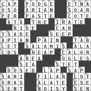 ACROSS 1. Head covering 4. Plash 9. Inactive volcano in Sicily 13. Bear (Spanish) 14. Believer in; advocate of (suffix) 15. Fly high 16. For each 17. Thick mixture 18. ____ d'Azur (French Riviera) 19. "One Day ___ Time" 21. Definite Article 22. Feeling or showing extreme anger 24. Travel on an animal 26. Auto 27. Sadhe (variant) 29. Ooze 30. Bee-related 31. Ache 33. Keyboard key 36. Allow 37. Deli grouping 40. Wing 41. Music discs 42. Pile 43. Bodily heat indicating an inflammation 45. Length times width 47. Stares at amorously 48. Ocean 49. Proofreading order 50. Administered medicine 52. Pet locale 54. Plant excrement 56. Indian skirt 57. Having threads 59. Car dealer's back yard 61. Mouths or openings 62. Having winglike extensions 63. Compass dir. 64. Posted 65. Annoyingly loud 66. Elected rep. DOWN 1. Police officer (slang) 2. Toward the sea 3. Likenesses of persons 4. Infant food 5. Declaim 6. Food container 7. Yard entry 8. Compass dir. 9. Fortification 10. A blast of a horn 11. Nathan's nickname 12. "We ___ not amused" (Victoria) 20. Opera by Verdi 22. Ancient Celtic tribe of eastern Britain 23. Actress Charlotte 25. Lairs 27. Baby powder 28. Drove too fast 29. Simple or foolish person 31. Entreaty 32. Auto club (abbr.) 33. Baron Munchausen's specialties 34. _ vera 35. Oblong pieces of solid material 38. Toward the future 39. Native of Scotland 44. Grows older 45. Help 46. To separate or throw off 49. Arguments over trivial matters 50. Have the gumption 51. NW Algerian seaport 52. _ and Stitch 53. Jai _ 55. Introduce or present, as a question 56. Distress signal 57. Air blower 58. Marina Del _, California 60. "___ Little Indians"